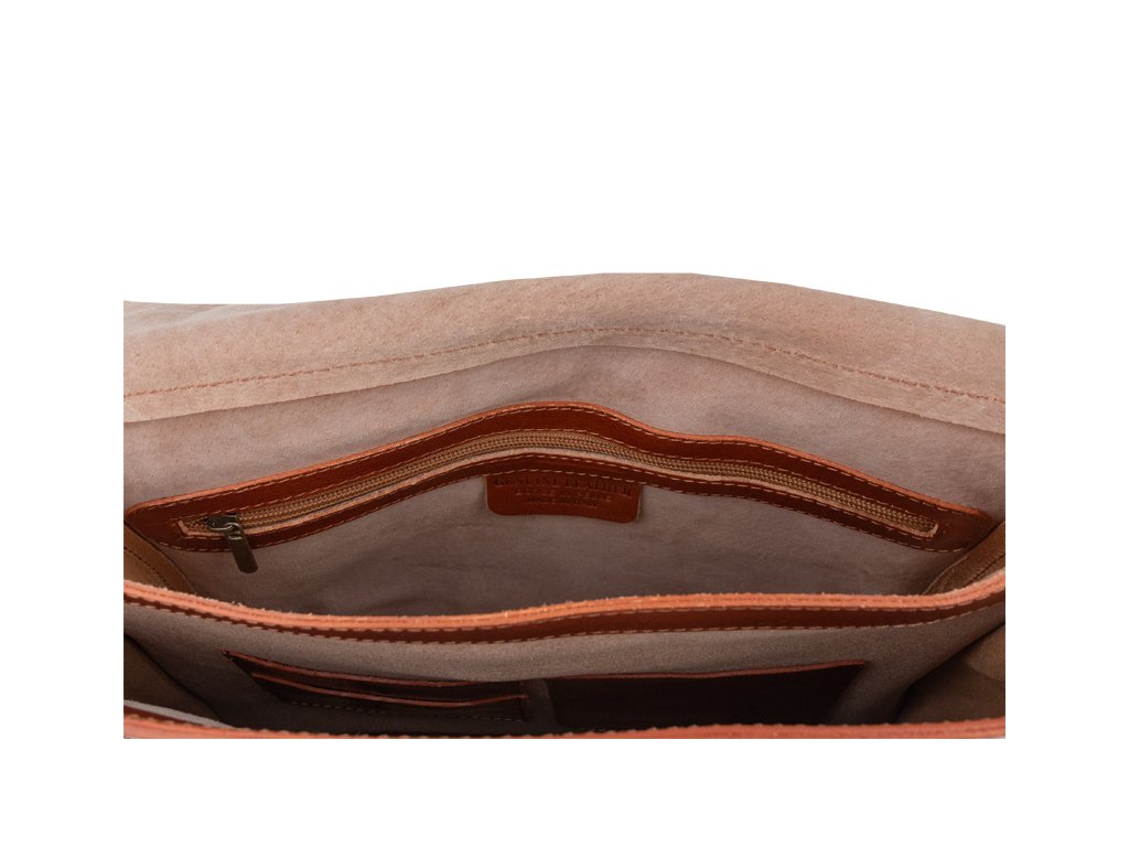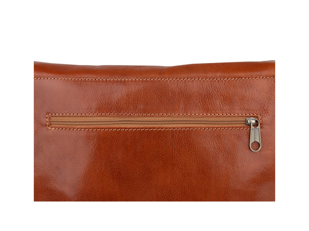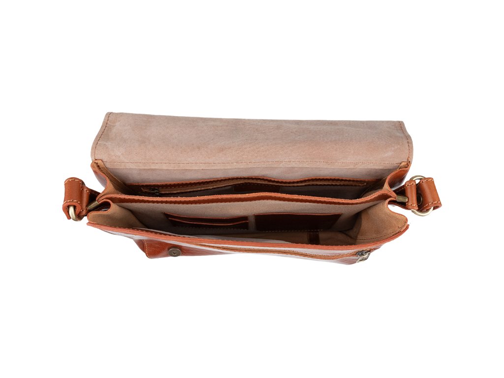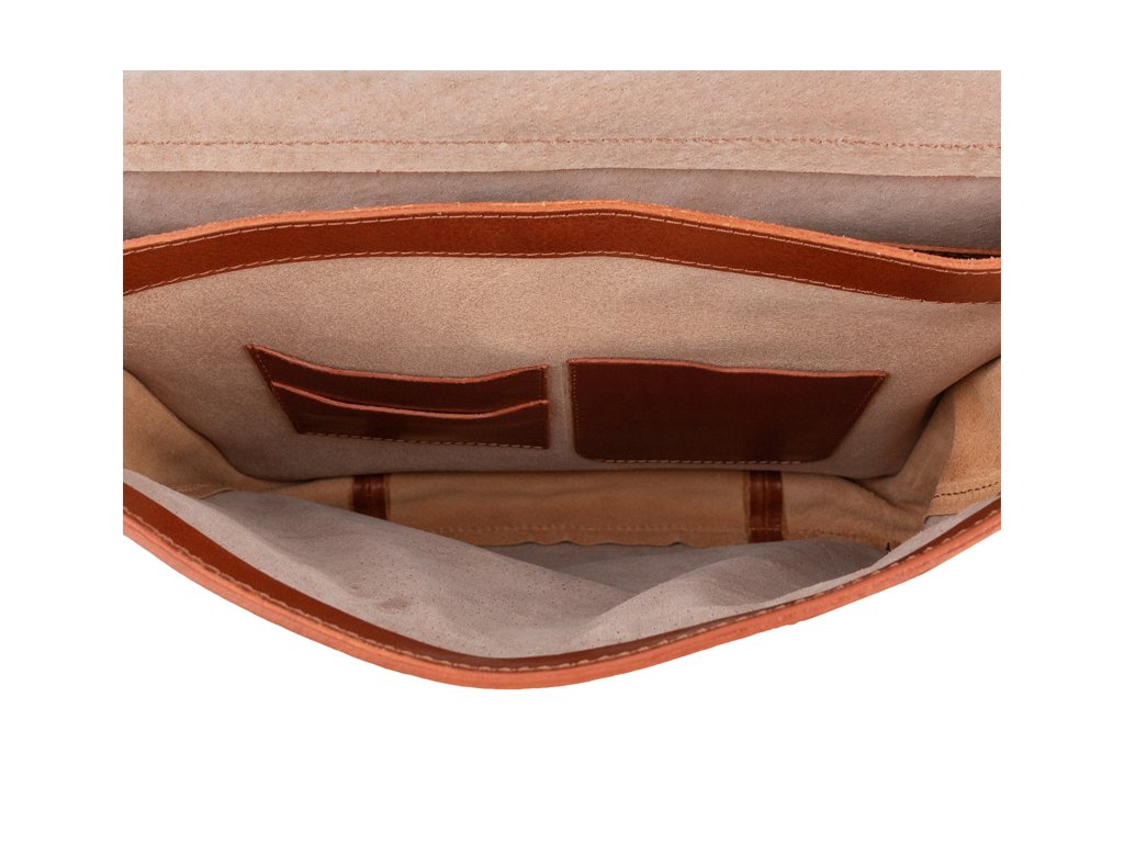 Už na prvý pohľad pôsobí táto camel aktovka ako veľmi kvalitný kúsok. Je vyrobená z pravej pevnej kože a veľmi dobre drží svoj tvar. Je vhodná na nosenie cez rameno alebo cross-body (krížom), popruh ponúka 5 rôznych nastavení dĺžky. Aktovka sa uzatvára pomocou dvoch magnetických patentiek. Vnútro kabelky je taktiež vyrobené z veľmi kvalitného materiálu. Je rozdelené na dve časti. Vnútro ponúka priehradku na mobil, zipsovacie vrecko a miesto určené na písacie potreby. Na zadnej vonkajšej i vnútornej strane sa nachádza vrecko na zips. Bez problémov do aktovky vložíte dokumenty formátu A4. Max. dĺžka popruhu je 120 cm.