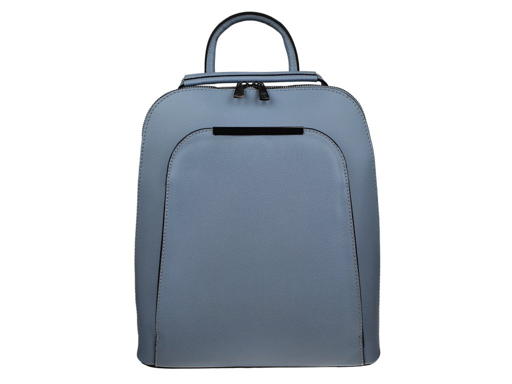 Modrý kožený batôžtek, sa strieborno-čiernymi kovovými doplnkami a zipsami..