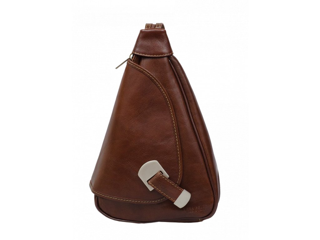 Jedinečný kožený batôžtek v hnedej farbe so zaujímavým tvarom. Dominantný je kovový detail (zapínanie) na prednej strane. Batôžtek sa otvára zboku a vo vnútri nájdete malé vrecko na zips. Veľmi zaujímavé a pútavé sú popruhy na batohu, ktorý sa rozopínajú pomocou zipsu a tým si môžete ľubovoľne zvoliť spôsob nosenia.