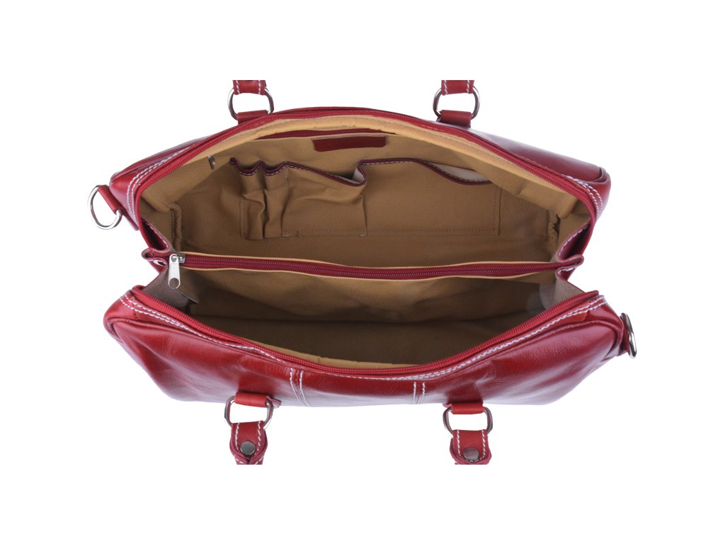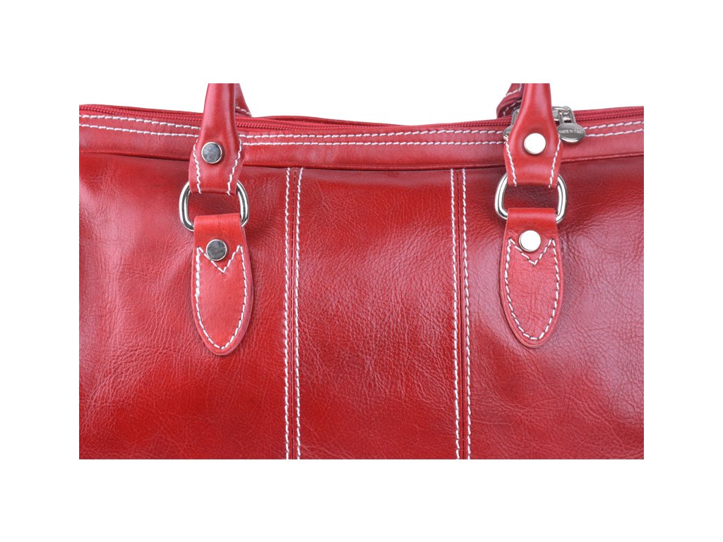 Elegantná a praktická cestovná taška v červenej farbe. Taška je vyrobená z pravej mäkkej kože. Uzatvára sa pomocou zipsu a súčasťou balenia je prídavný popruh (107 cm) na nosenie cez rameno. Vnútro tašky je dostatočne priestranné s praktickým uzatvárateľným vreckom na zips.
