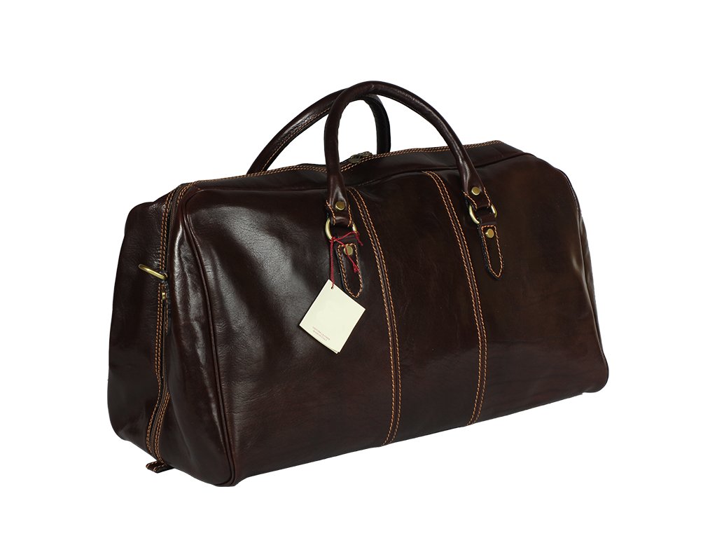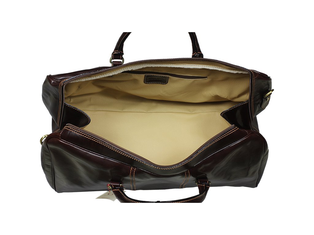 Elegantná a praktická cestovná taška v hnedej farbe. Taška je vyrobená z pravej mäkkej kože. Uzatvára sa pomocou zipsu a súčasťou balenia je prídavný popruh na nosenie cez rameno. Vnútro tašky je dostatočne priestranné s praktickým uzatvárateľným vreckom na zips.