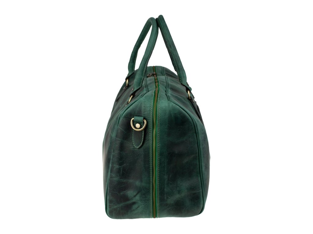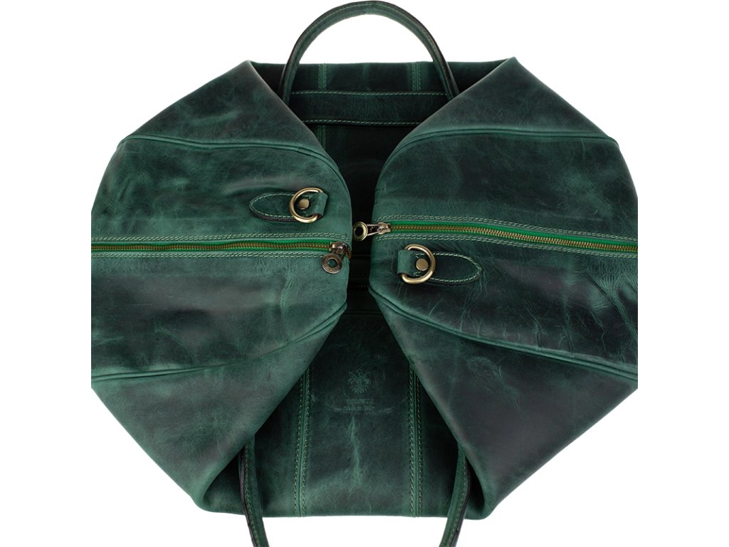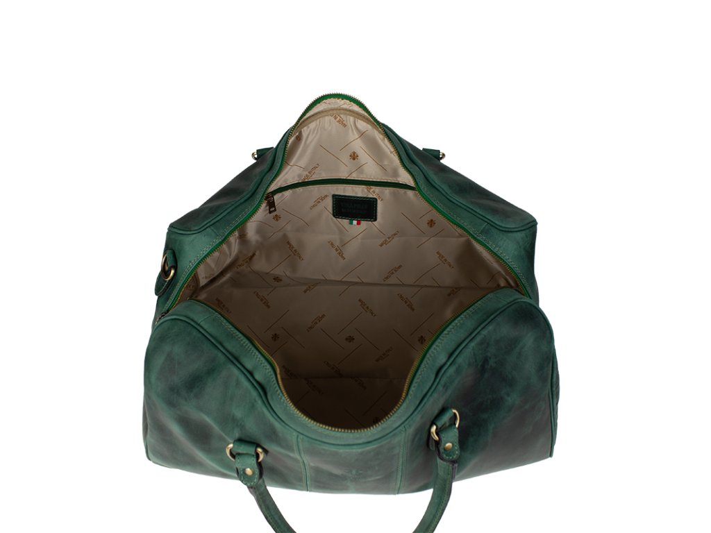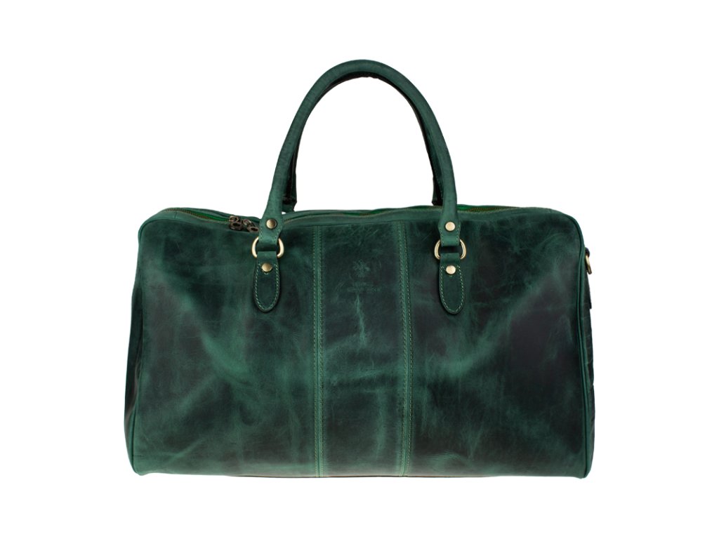 Luxusná kožená cestovná taška v zelenej farbe. Taška je vyrobená z hladkej kvalitnej Talianskej kože s voskovanou úpravou, ktorá dodáva taške úžasnú patinu. Súčasťou tašky je prídavný popruh s dĺžkou 107 cm. Taška sa uzatvára kovovým zipsom. Cestujte štýlovo s koženou taškou!