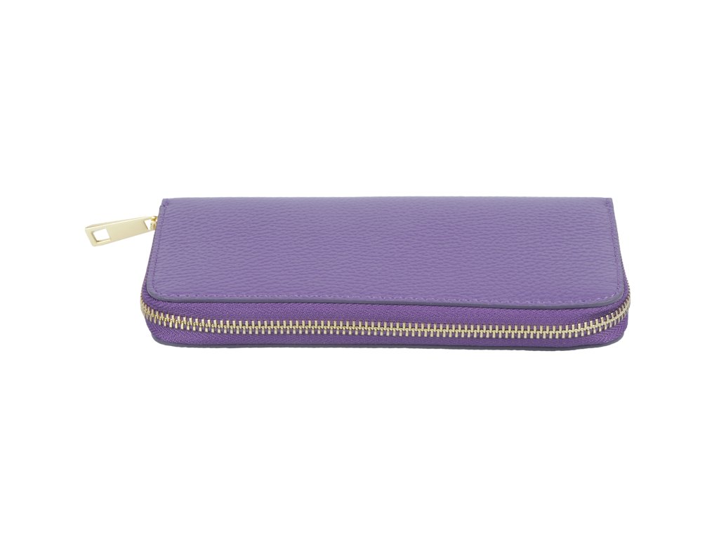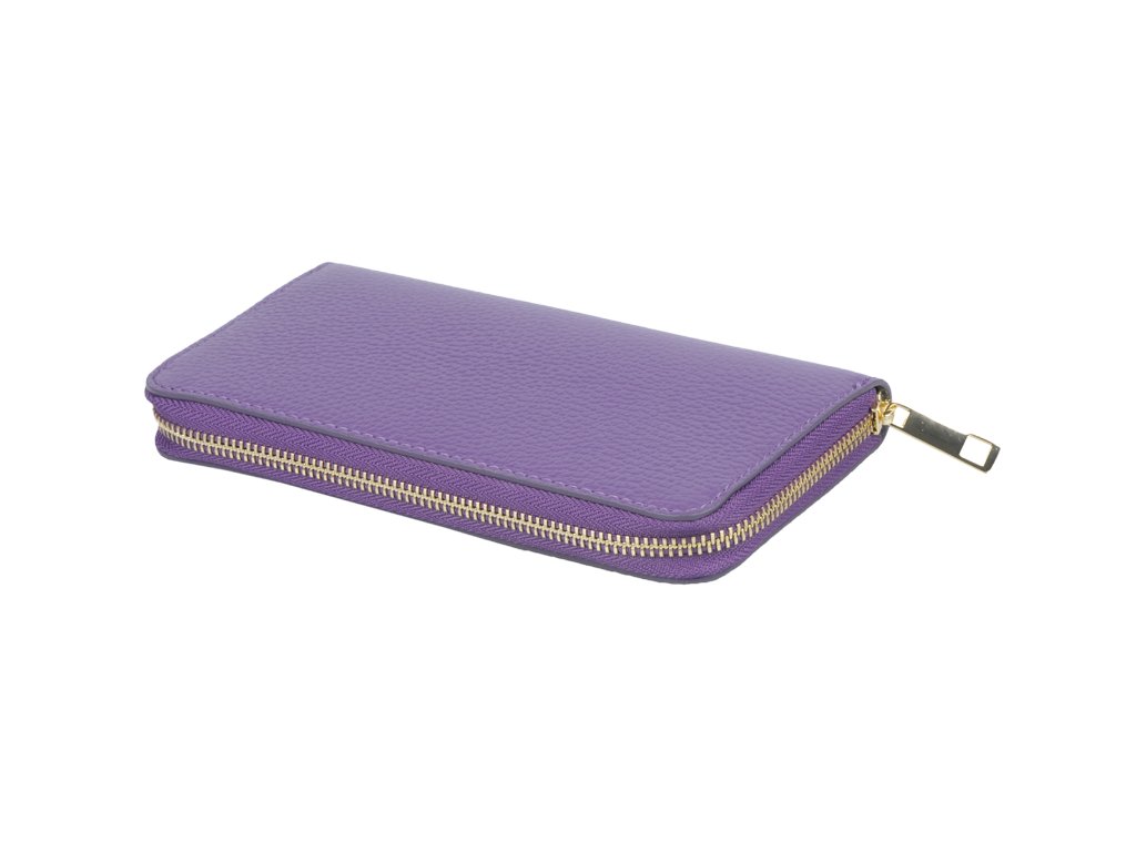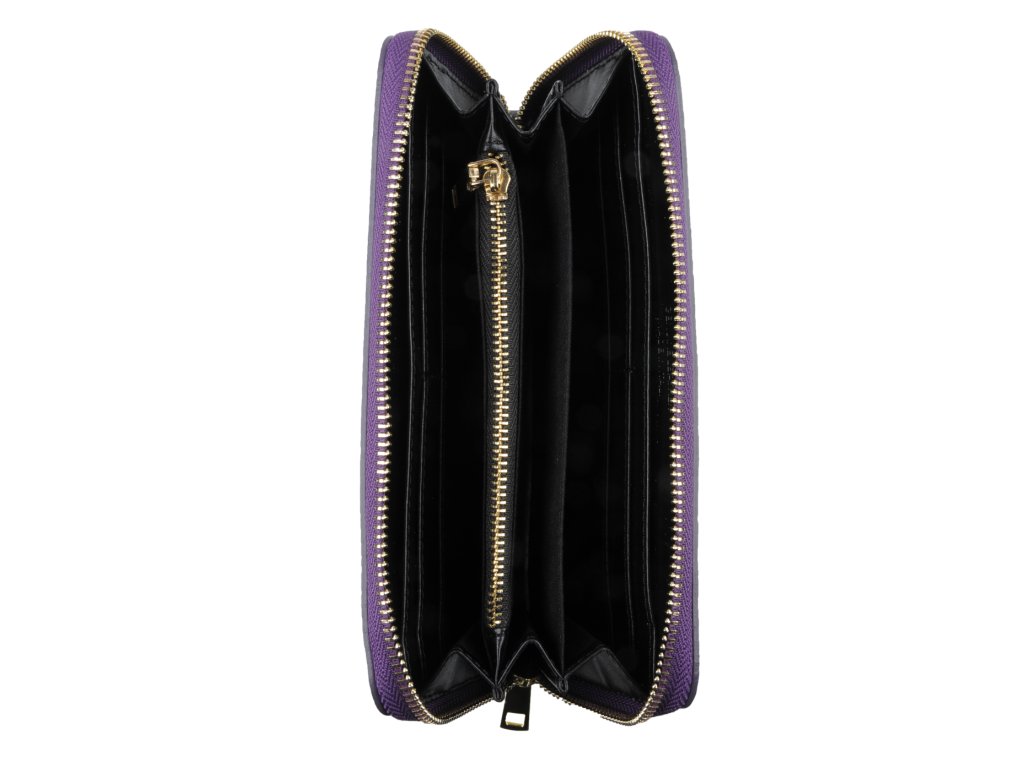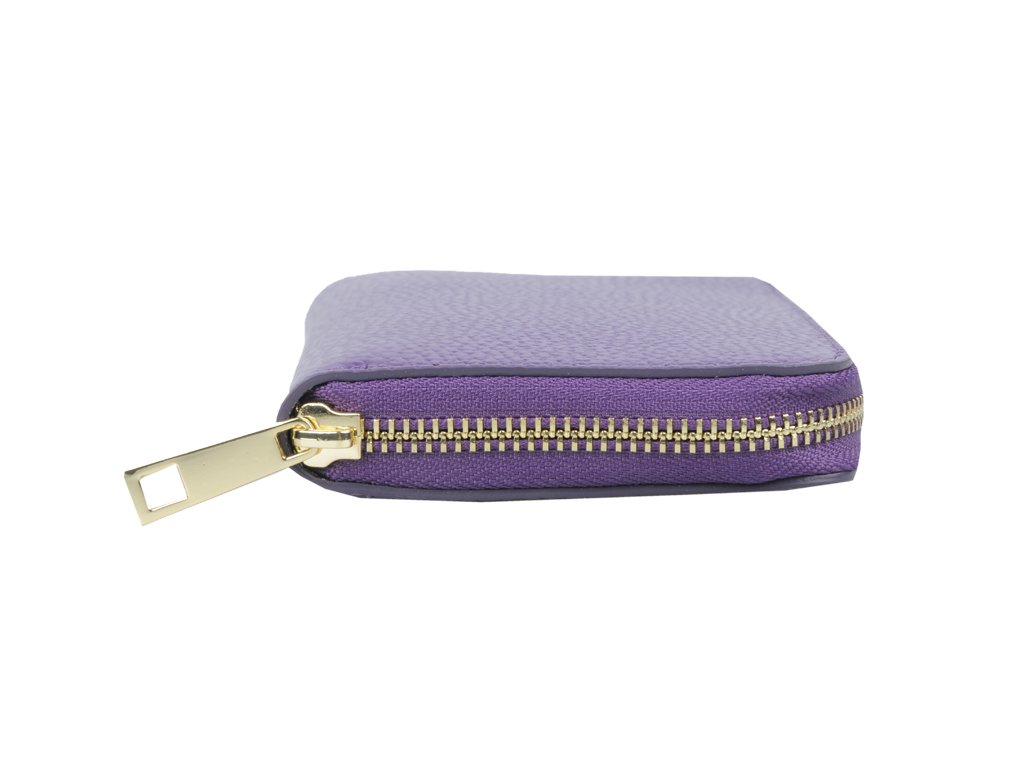 Jednoduchá peňaženka fialovej farby. Disponuje množstvom odkladacích priestorov pre kreditné karty, doklady, bankovky, mince. Uzatvára sa na zips a kovový patent.