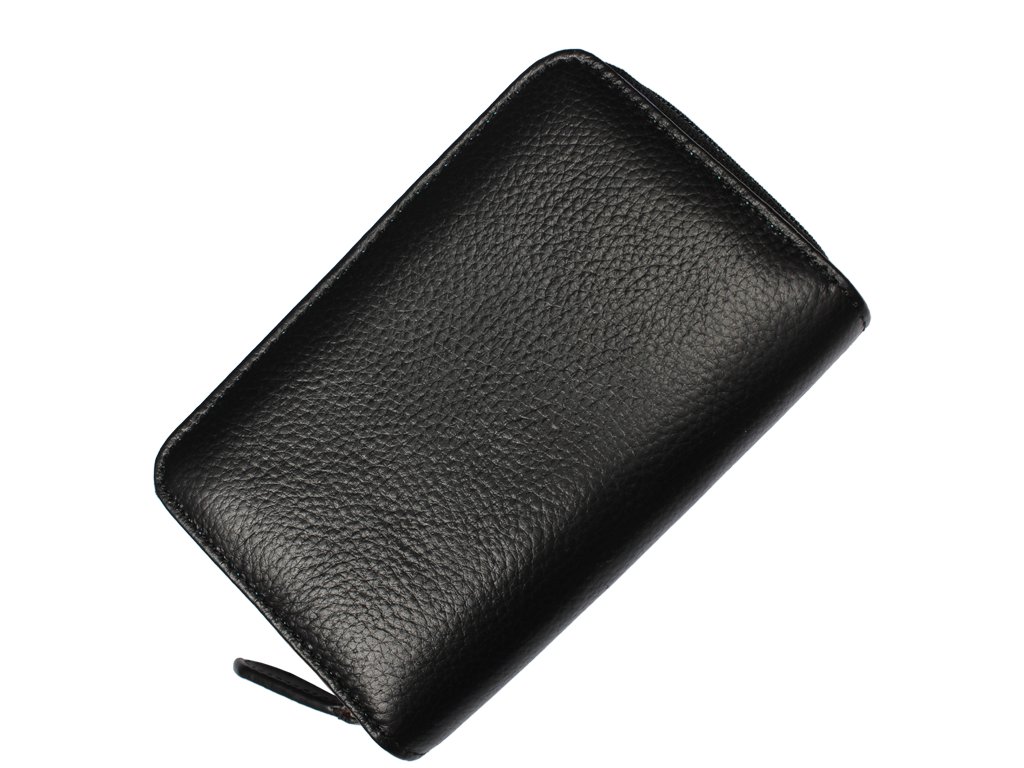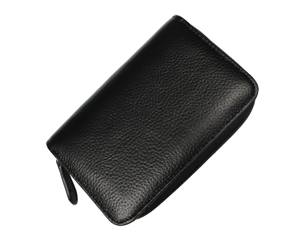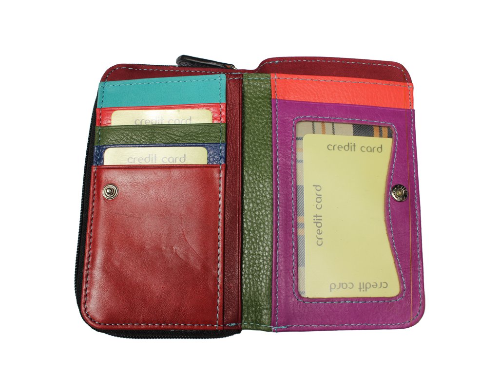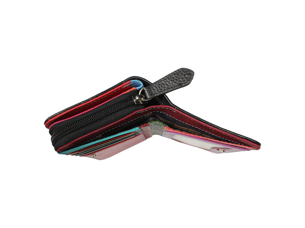 Jednoduchá peňaženka čiernej farby, ktorá vo vnútri hýri rôznymi inými farbami. Disponuje množstvom odkladacích priestorov pre kreditné karty, doklady, bankovky, mince. Uzatvára sa na zips a kovový patent.