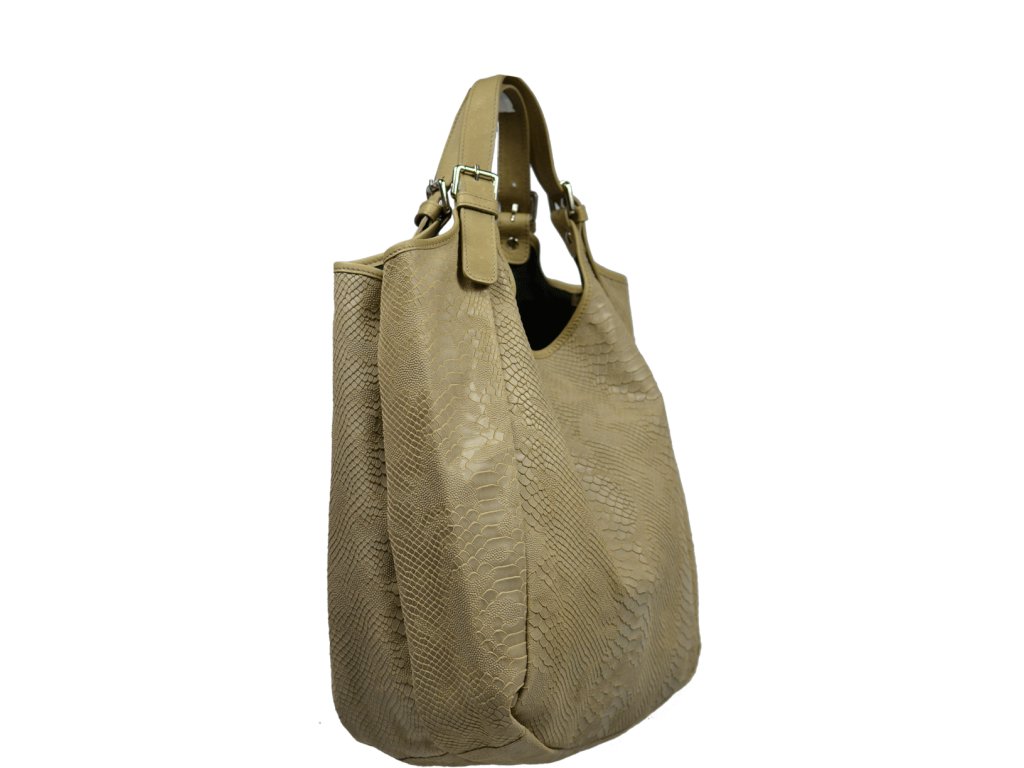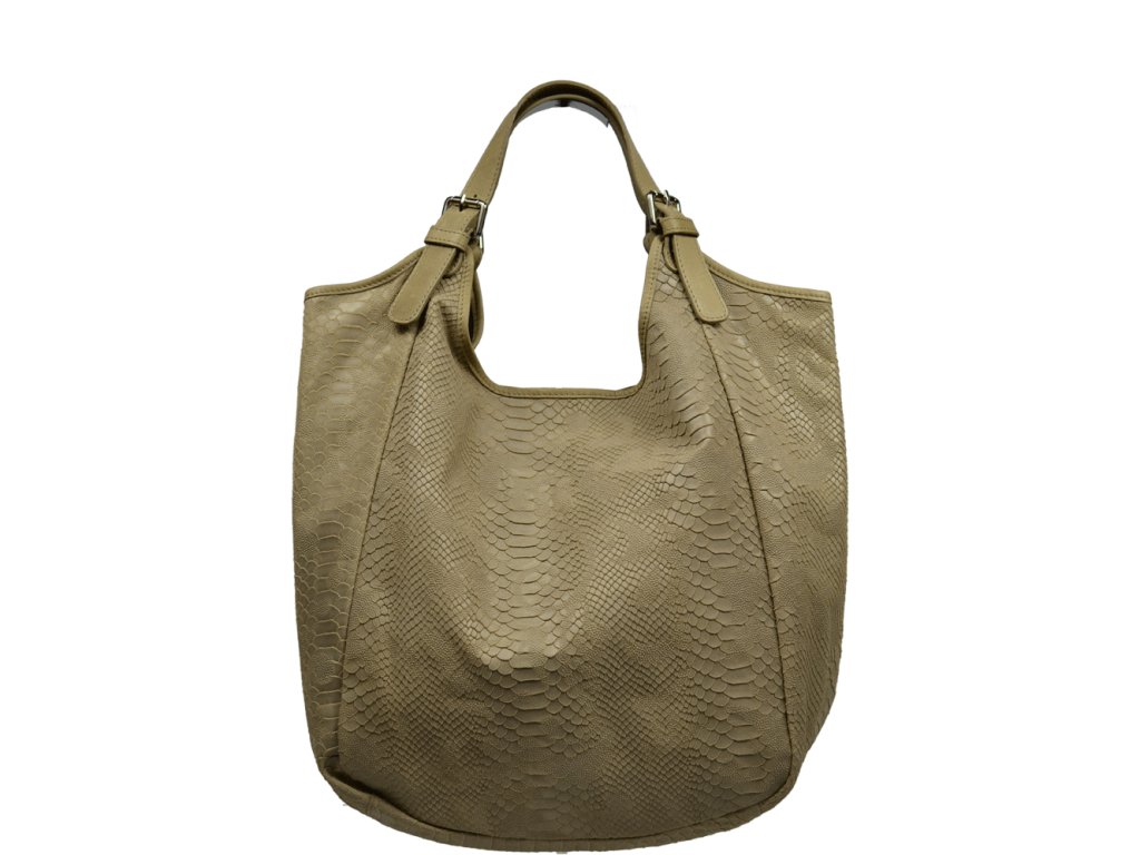 Praktická priestranná kabelka cez rameno v okrovej farbe s haďou textúrou. Pohodlne sa do nej vojdu dokumenty formátu A4, čo je vhodné pre bežné každodenné nosenie. Táto kožená kabelka má nastaviteľné uši a je uzatvárateľná na magnetický patent. Vo vnútri disponuje väčším vreckom na zips, ďalšou priehradkou so zipsom a dvoma malými vreckami napr. pre kľúče či mobil.