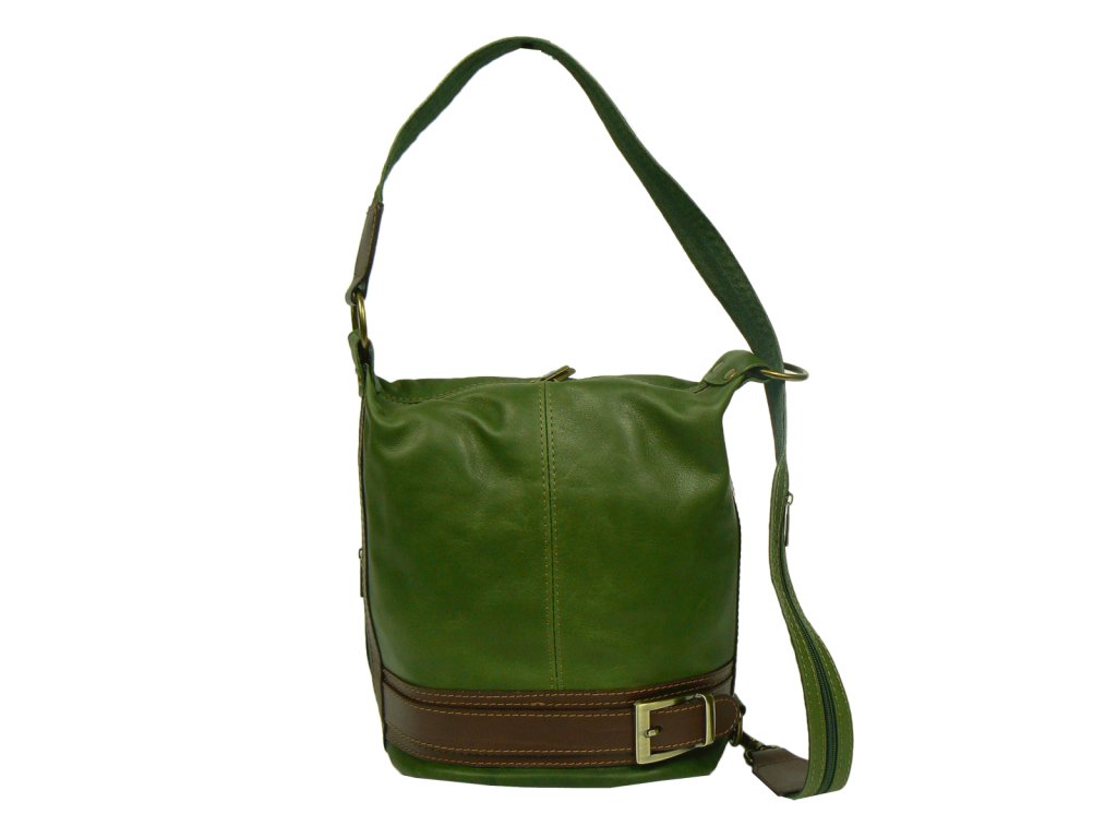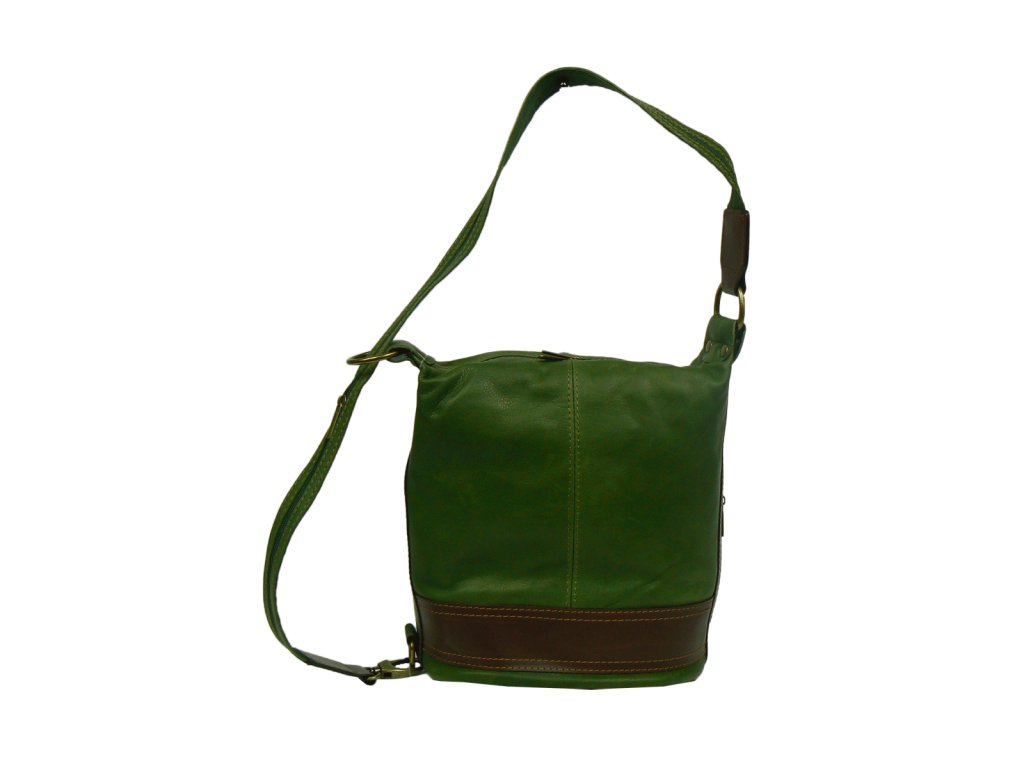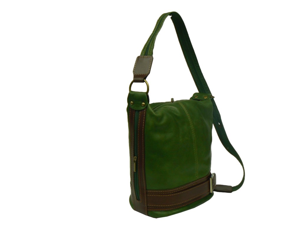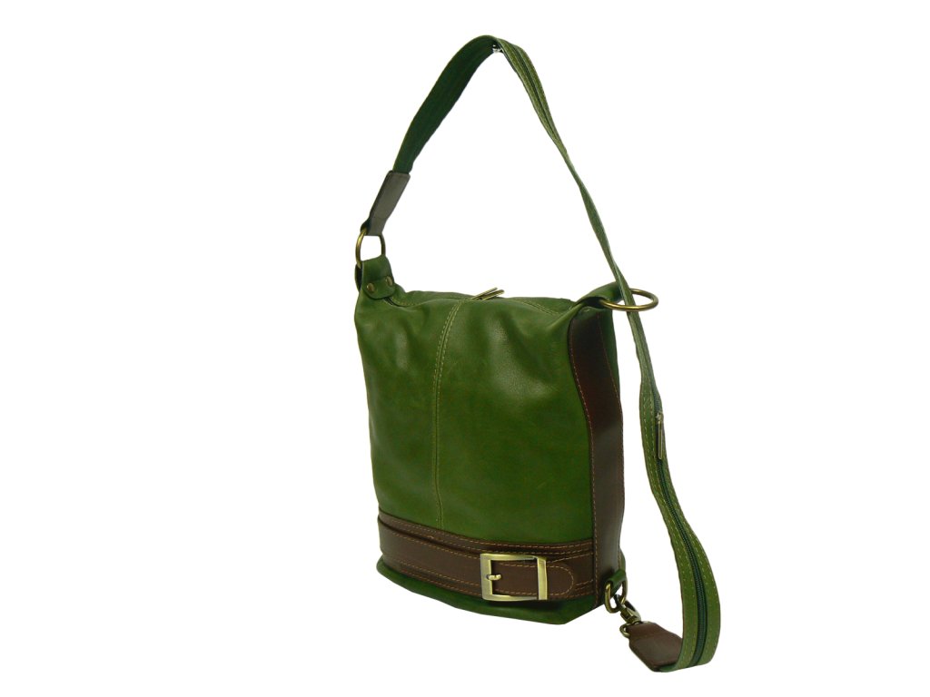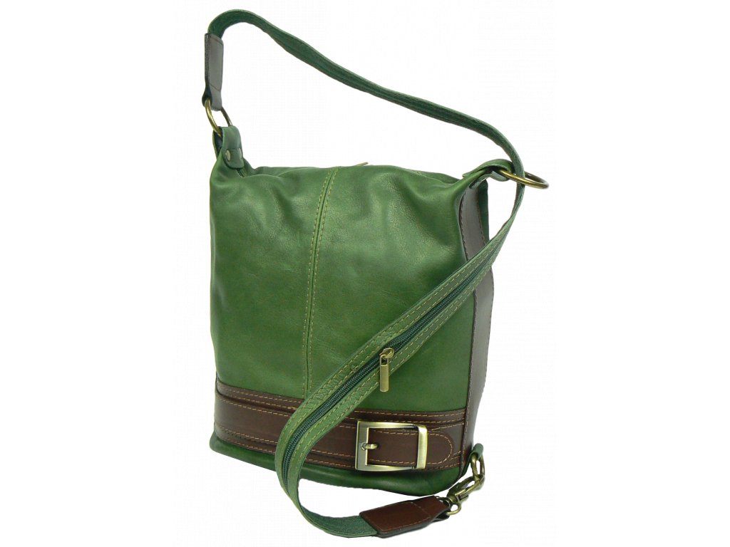 Zelená praktická kabelka s netypickým štýlom, ktorej dodáva jedinečnosť hnedý ozdobný pás po jej obvode v spodnej časti. Kabelka je vyrobená z pravej poctivej kože a uzatvára sa pomocou zipsu. Nastaviteľný popruh ponúka viaceré možnosti nosenia kabelky. Buď cez rameno, za ramenom alebo ako batôžtek. Vo vnútri disponuje kabelka malým vreckom na zips. Dĺžka popruhu je 96 cm.