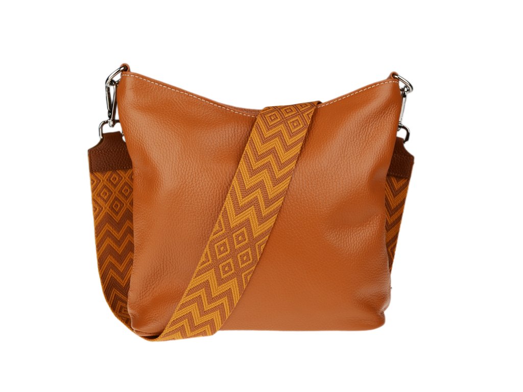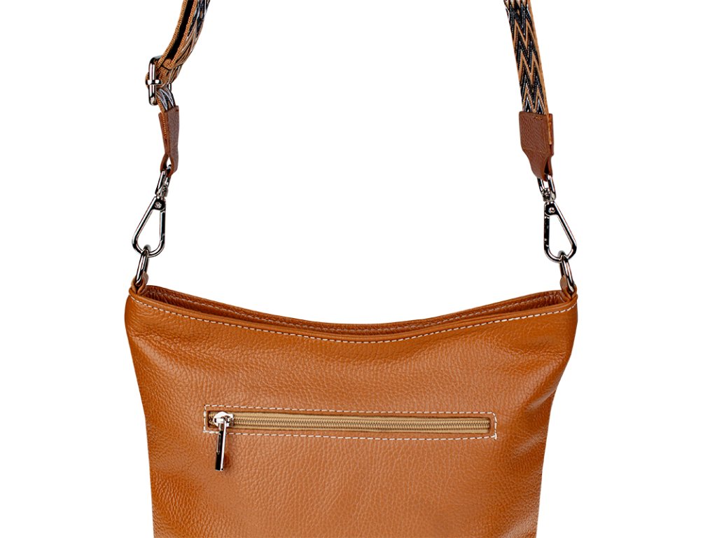 Jednoduchá a praktická kabelka vhodná na každodenné nosenie v univerzálnej camel farbe. Je vyrobená z pravej poctivej kože a uzatvára sa pomocou zipsu. Vo vnútri nájdete priečku uprostred, ktorá súčasne slúži ako vrecko na zips, a malé vrecko a priehradku na bočných stenách. Hĺbka dna tejto kabelky je 11 cm.