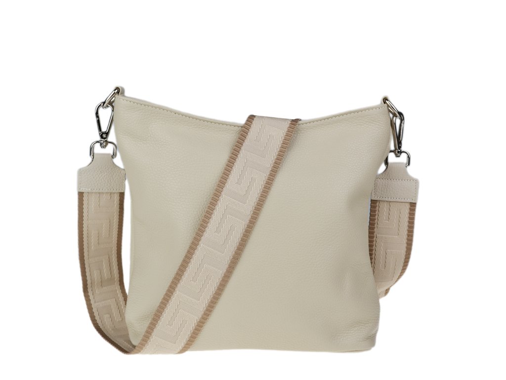 Jednoduchá a praktická kabelka vhodná na každodenné nosenie v univerzálnej béžovej farbe. Je vyrobená z pravej poctivej kože a uzatvára sa pomocou zipsu. Vo vnútri nájdete priečku uprostred, ktorá súčasne slúži ako vrecko na zips, a malé vrecko a priehradku na bočných stenách. Hĺbka dna tejto kabelky je 11 cm.
