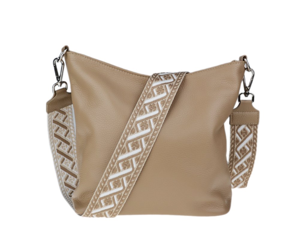 Jednoduchá a praktická kabelka vhodná na každodenné nosenie v univerzálnej béžovej farbe. Je vyrobená z pravej poctivej kože a uzatvára sa pomocou zipsu. Vo vnútri nájdete priečku uprostred, ktorá súčasne slúži ako vrecko na zips, a malé vrecko a priehradku na bočných stenách. Hĺbka dna tejto kabelky je 11 cm.