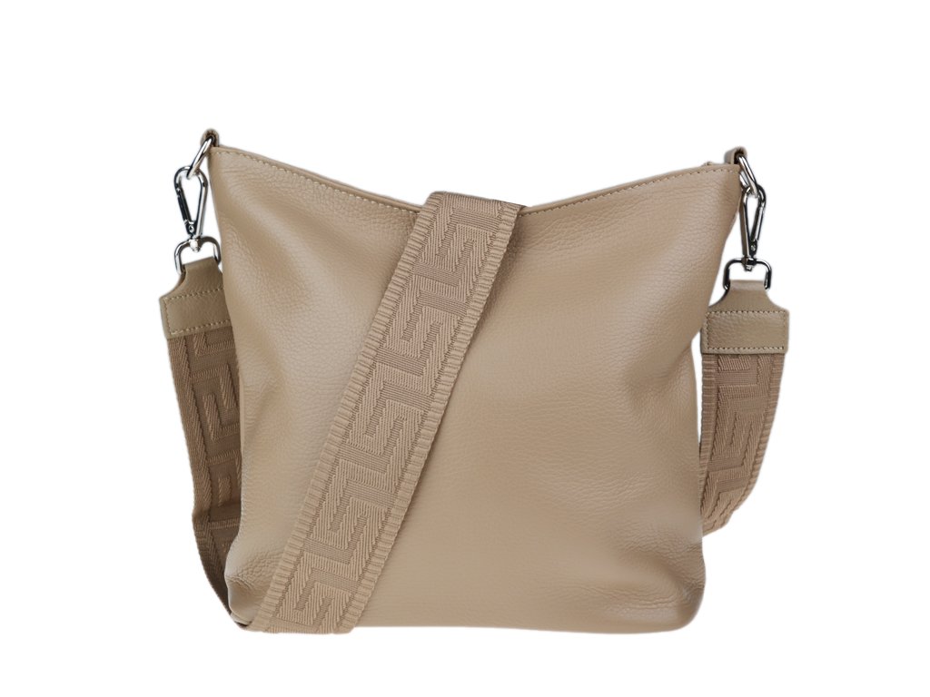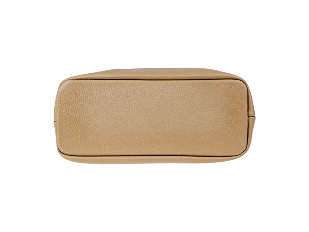 Jednoduchá a praktická kabelka vhodná na každodenné nosenie v univerzálnej béžovej farbe. Je vyrobená z pravej poctivej kože a uzatvára sa pomocou zipsu. Vo vnútri nájdete priečku uprostred, ktorá súčasne slúži ako vrecko na zips, a malé vrecko a priehradku na bočných stenách. Hĺbka dna tejto kabelky je 11 cm.