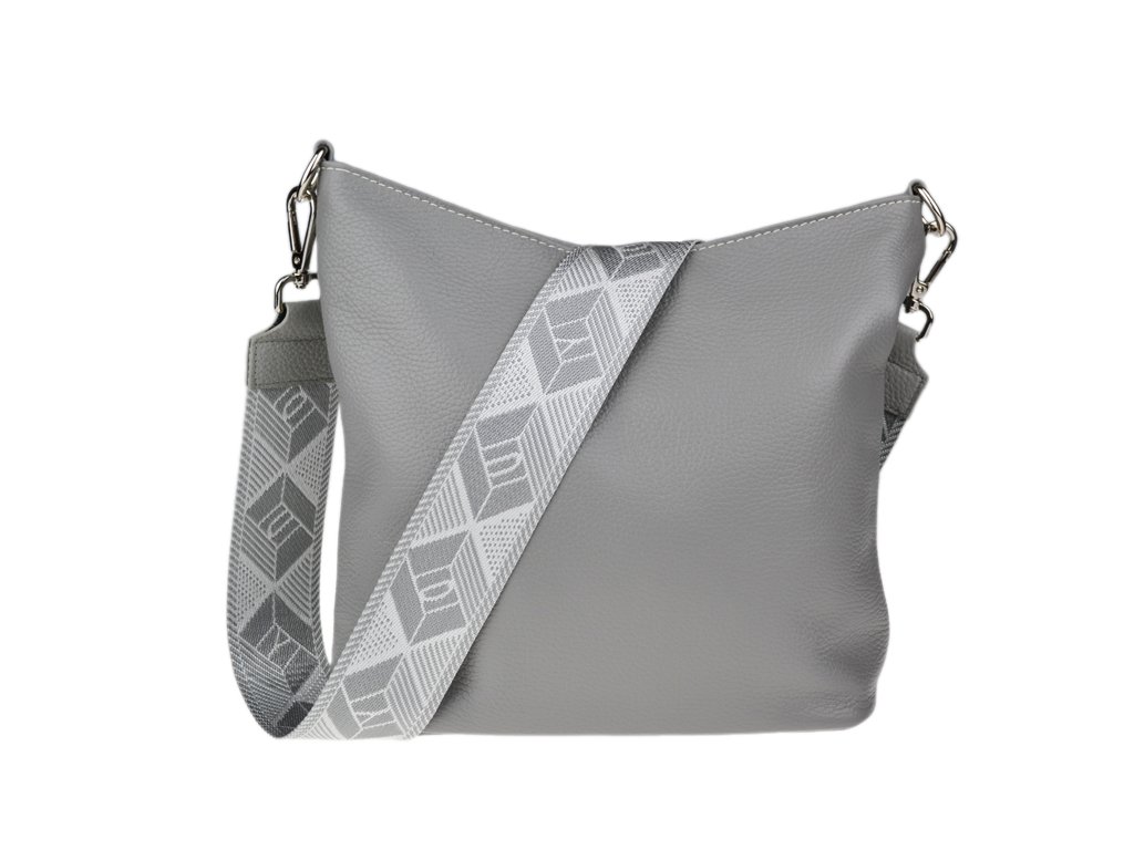Jednoduchá a praktická kabelka vhodná na každodenné nosenie v univerzálnej sivej farbe. Je vyrobená z pravej poctivej kože a uzatvára sa pomocou zipsu. Vo vnútri nájdete priečku uprostred, ktorá súčasne slúži ako vrecko na zips, a malé vrecko a priehradku na bočných stenách. Hĺbka dna tejto kabelky je 11 cm.