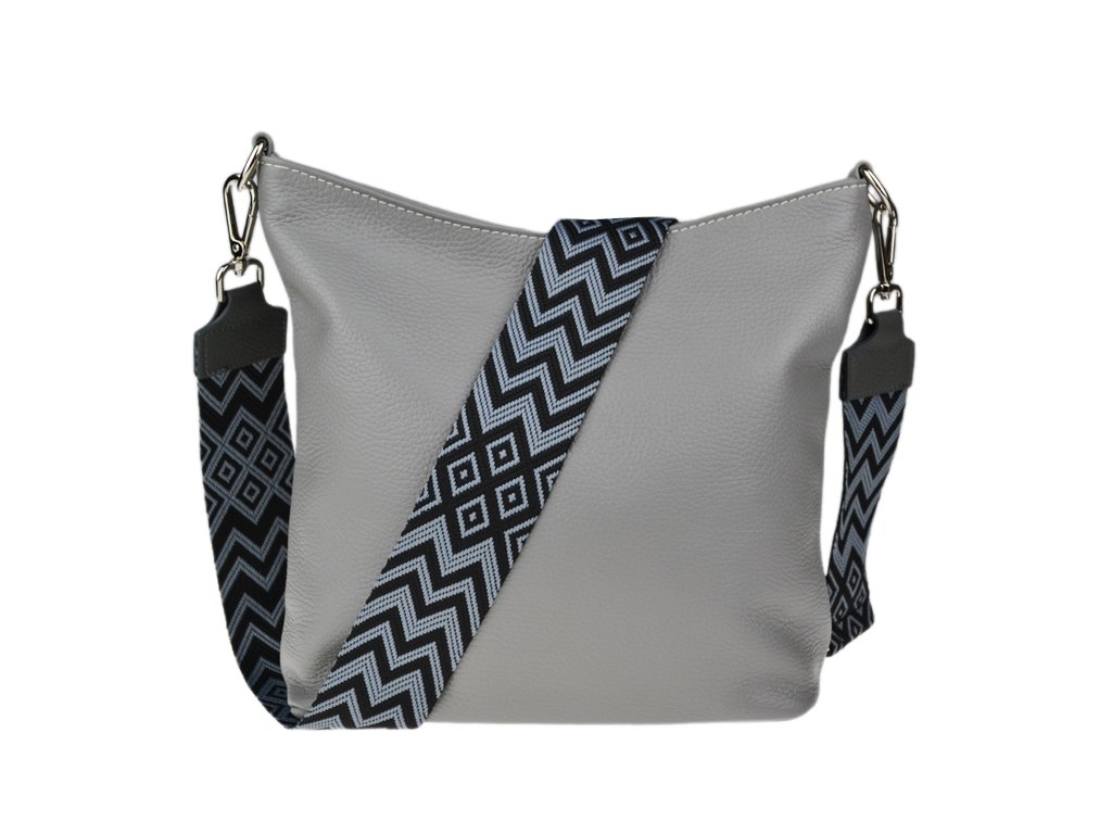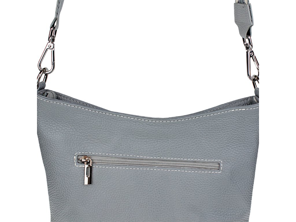 Jednoduchá a praktická kabelka vhodná na každodenné nosenie v univerzálnej sivej farbe. Je vyrobená z pravej poctivej kože a uzatvára sa pomocou zipsu. Vo vnútri nájdete priečku uprostred, ktorá súčasne slúži ako vrecko na zips, a malé vrecko a priehradku na bočných stenách. Hĺbka dna tejto kabelky je 11 cm.