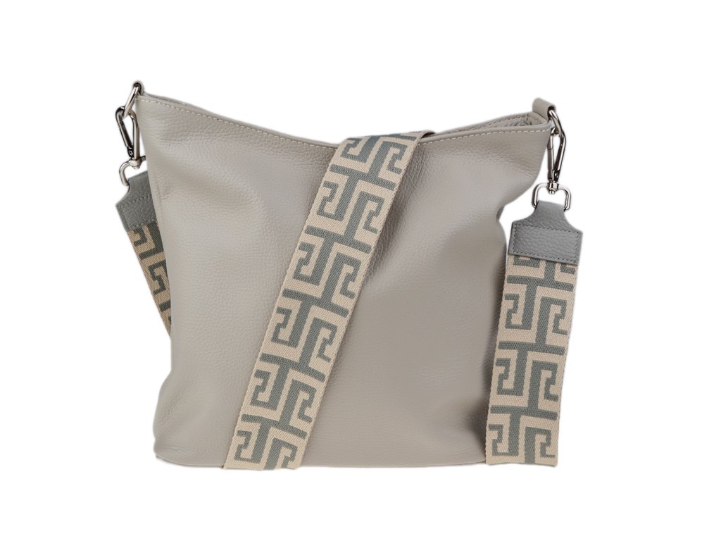 Jednoduchá a praktická kabelka vhodná na každodenné nosenie v univerzálnej sivej farbe. Je vyrobená z pravej poctivej kože a uzatvára sa pomocou zipsu. Vo vnútri nájdete priečku uprostred, ktorá súčasne slúži ako vrecko na zips, a malé vrecko a priehradku na bočných stenách. Hĺbka dna tejto kabelky je 11 cm.