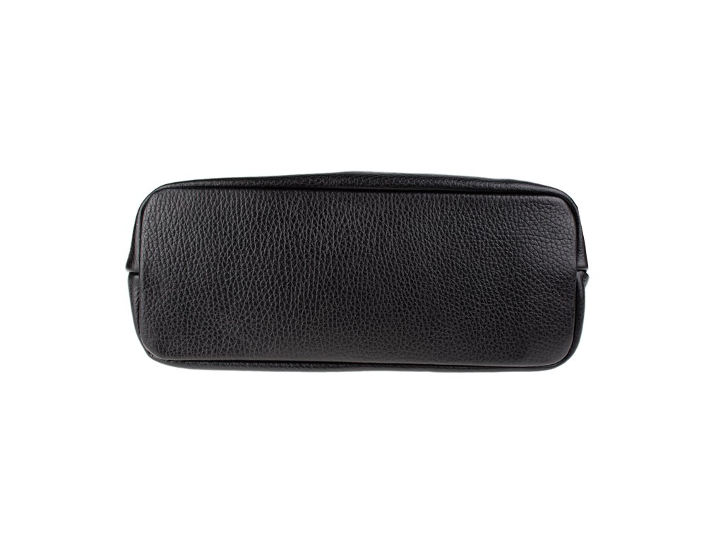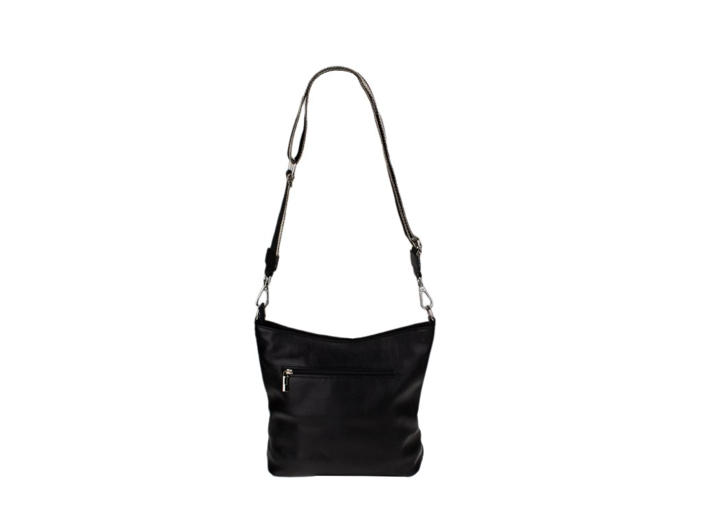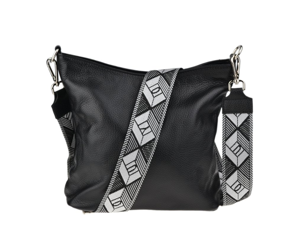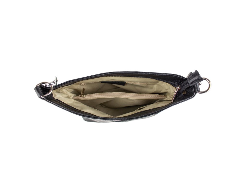 Jednoduchá a praktická kabelka vhodná na každodenné nosenie v univerzálnej čiernej farbe. Je vyrobená z pravej poctivej kože a uzatvára sa pomocou zipsu. Vo vnútri nájdete priečku uprostred, ktorá súčasne slúži ako vrecko na zips, a malé vrecko a priehradku na bočných stenách. Hĺbka dna tejto kabelky je 11 cm.