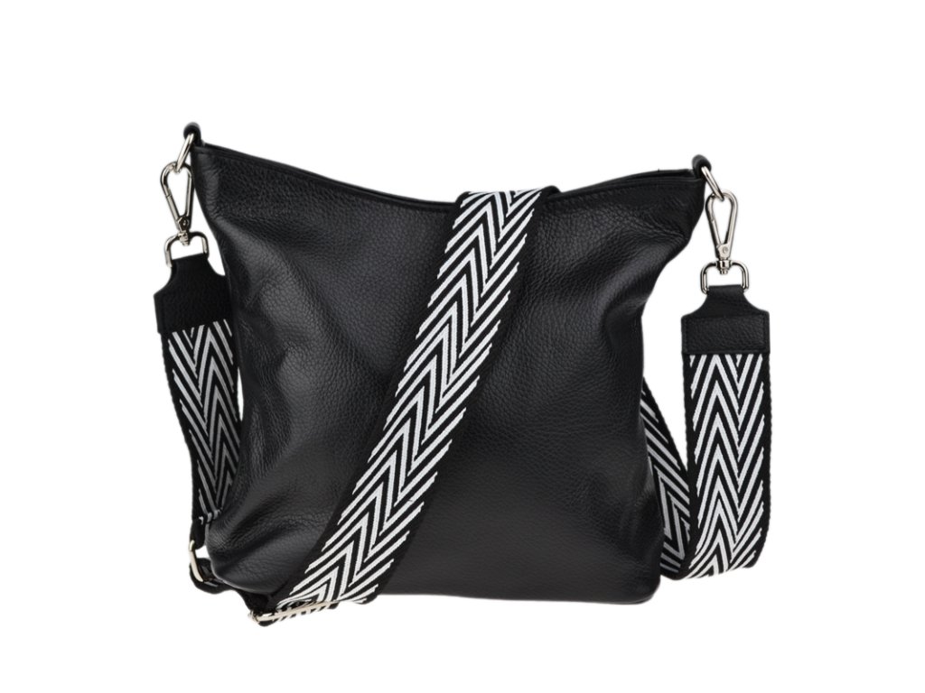 Jednoduchá a praktická kabelka vhodná na každodenné nosenie v univerzálnej čiernej farbe. Je vyrobená z pravej poctivej kože a uzatvára sa pomocou zipsu. Vo vnútri nájdete priečku uprostred, ktorá súčasne slúži ako vrecko na zips, a malé vrecko a priehradku na bočných stenách. Hĺbka dna tejto kabelky je 11 cm.