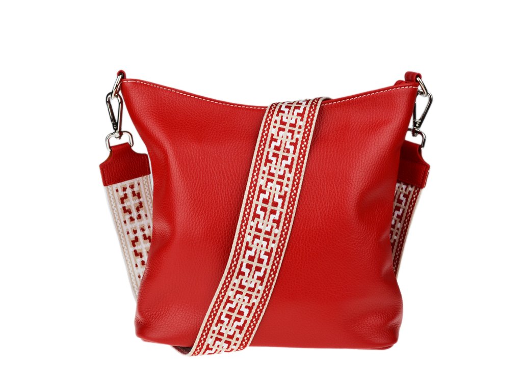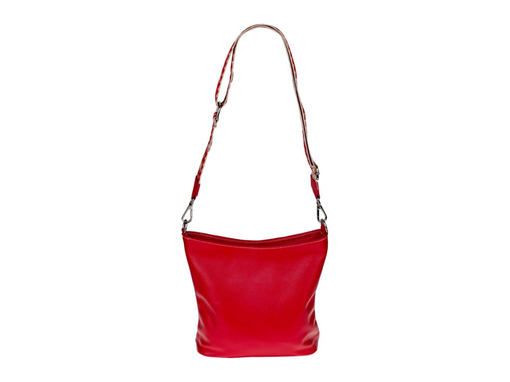 Jednoduchá a praktická kabelka vhodná na každodenné nosenie v univerzálnej červenej farbe. Je vyrobená z pravej poctivej kože a uzatvára sa pomocou zipsu. Vo vnútri nájdete priečku uprostred, ktorá súčasne slúži ako vrecko na zips, a malé vrecko a priehradku na bočných stenách. Hĺbka dna tejto kabelky je 11 cm.