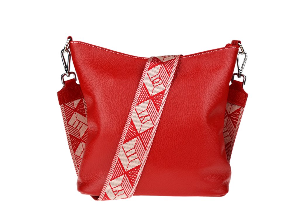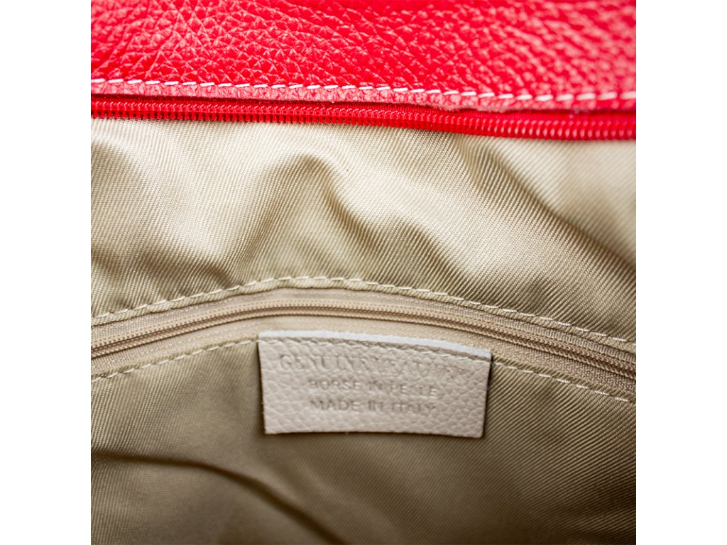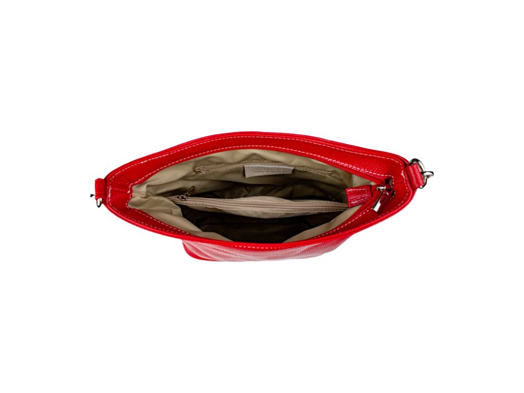 Jednoduchá a praktická kabelka vhodná na každodenné nosenie v univerzálnej červenej farbe. Je vyrobená z pravej poctivej kože a uzatvára sa pomocou zipsu. Vo vnútri nájdete priečku uprostred, ktorá súčasne slúži ako vrecko na zips, a malé vrecko a priehradku na bočných stenách. Hĺbka dna tejto kabelky je 11 cm.