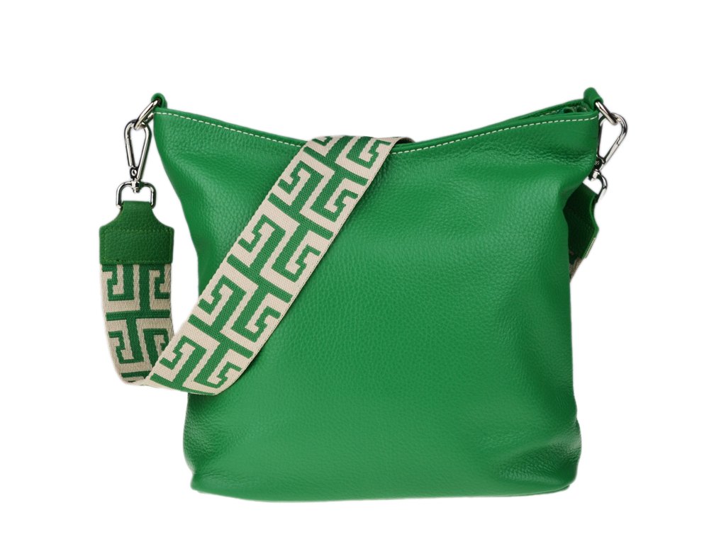 Jednoduchá a praktická kabelka vhodná na každodenné nosenie v univerzálnej zelenej farbe. Je vyrobená z pravej poctivej kože a uzatvára sa pomocou zipsu. Vo vnútri nájdete priečku uprostred, ktorá súčasne slúži ako vrecko na zips, a malé vrecko a priehradku na bočných stenách. Hĺbka dna tejto kabelky je 11 cm.
