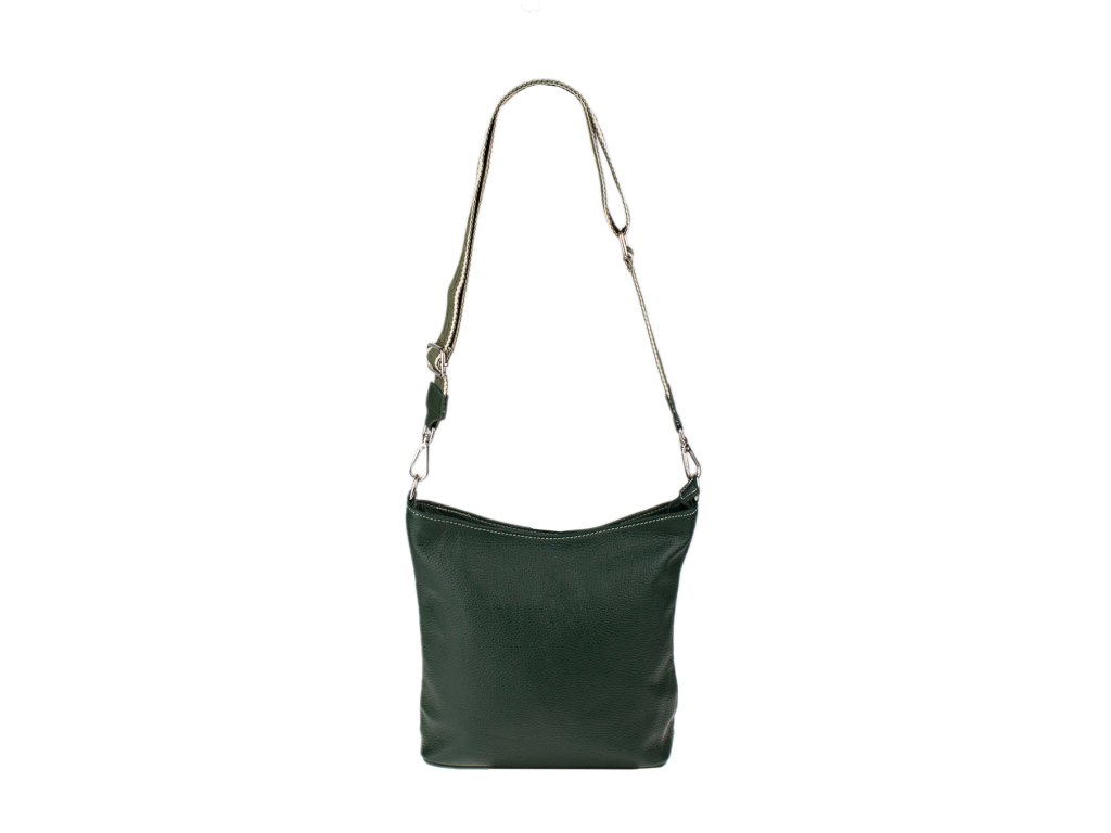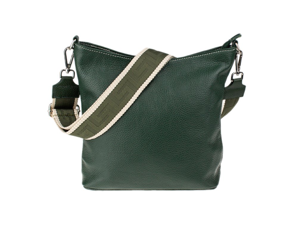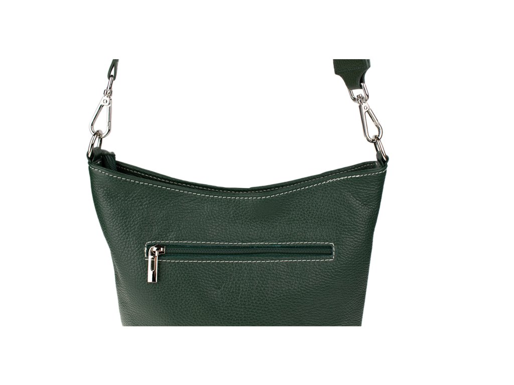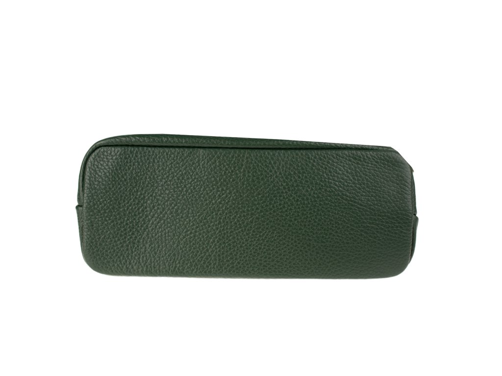 Jednoduchá a praktická kabelka vhodná na každodenné nosenie v univerzálnej zelenej farbe. Je vyrobená z pravej poctivej kože a uzatvára sa pomocou zipsu. Vo vnútri nájdete priečku uprostred, ktorá súčasne slúži ako vrecko na zips, a malé vrecko a priehradku na bočných stenách. Hĺbka dna tejto kabelky je 11 cm.