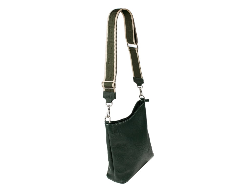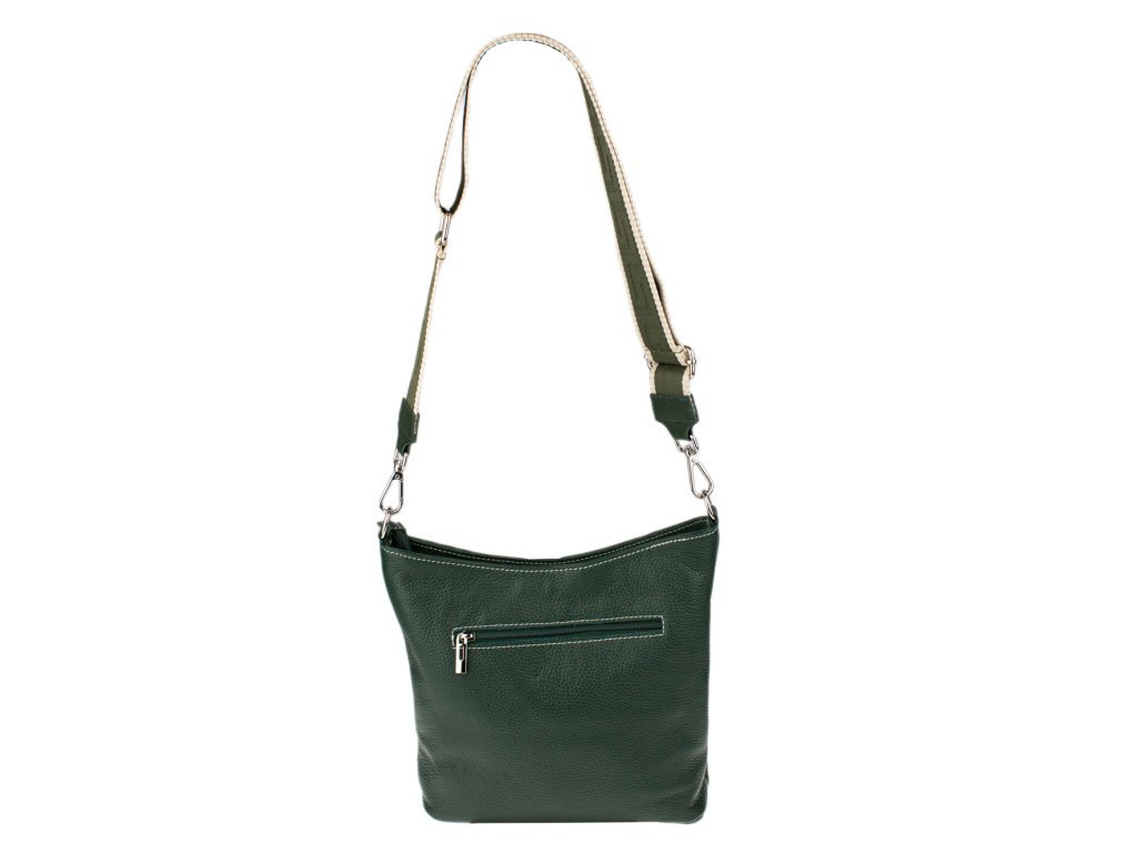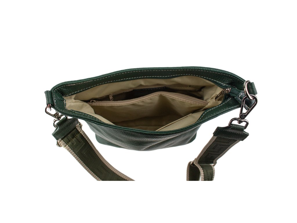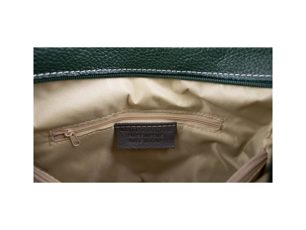 Jednoduchá a praktická kabelka vhodná na každodenné nosenie v univerzálnej zelenej farbe. Je vyrobená z pravej poctivej kože a uzatvára sa pomocou zipsu. Vo vnútri nájdete priečku uprostred, ktorá súčasne slúži ako vrecko na zips, a malé vrecko a priehradku na bočných stenách. Hĺbka dna tejto kabelky je 11 cm.
