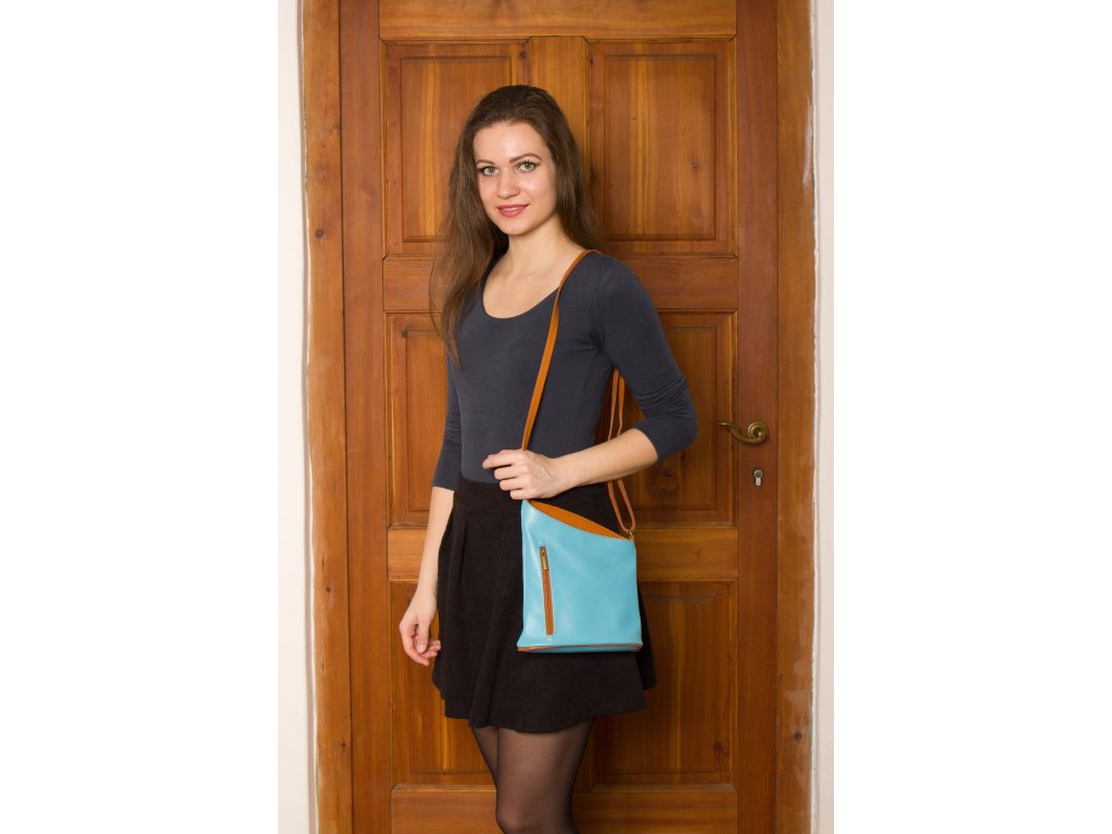 Malá a veľmi praktická kabelka na každodenné nosenie, ktorá Vás osloví najmä svojou jednoduchosťou a zaujímavým tvarom. Je vyrobená z pravej hladkej kože v modrej farbe a uzatvára sa pomocou zipsu. Vďaka nastaviteľnému popruhu je možné kabelku nosiť cez rameno alebo crossbody (krížom). Z vonkajšej strany ponúka dve vrecká na zips, vrecko na prednej strane sa uzatvára vertikálne a na zadnej strane horizontálne. Vo vnútri kabelka disponuje ešte jedným malým vreckom na zips, vhodným napríklad pre Váš mobil alebo kľúče. Dĺžka popruhu je max. cca 110 cm.