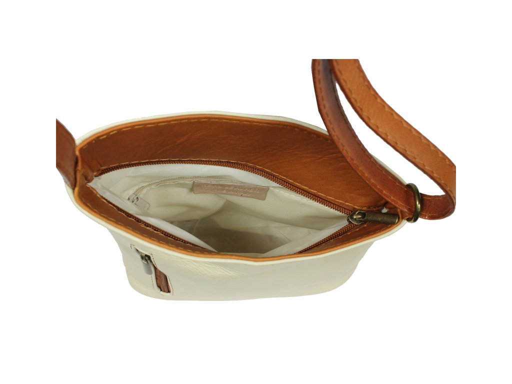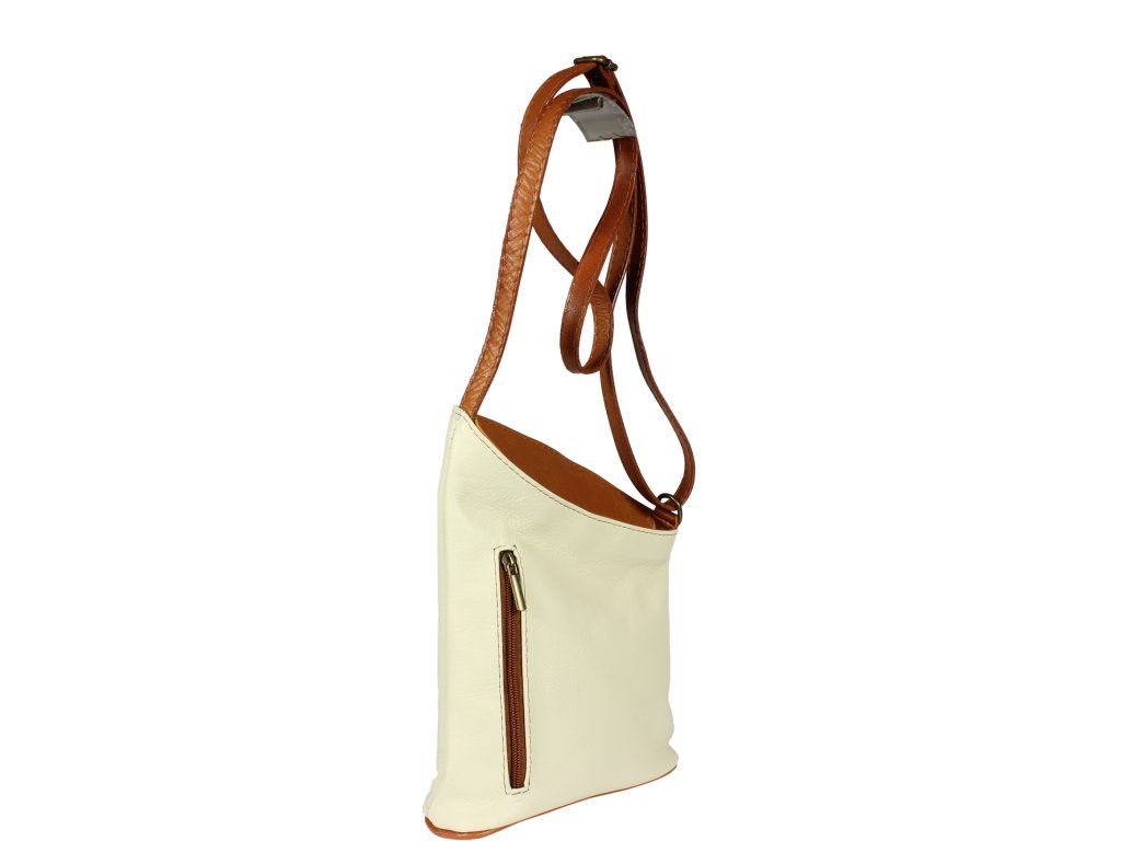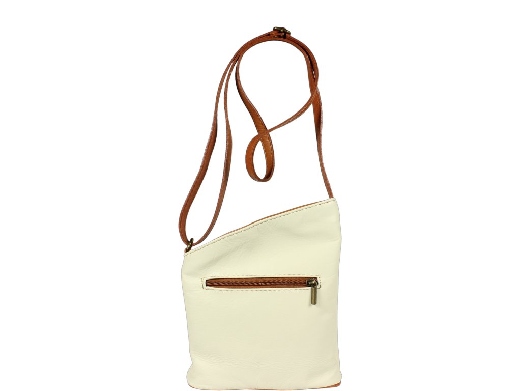 Malá a veľmi praktická kabelka na každodenné nosenie, ktorá Vás osloví najmä svojou jednoduchosťou a zaujímavým tvarom. Je vyrobená z pravej hladkej kože a uzatvára sa pomocou zipsu. Vďaka nastaviteľnému popruhu je možné kabelku nosiť cez rameno alebo cross-body (krížom). Z vonkajšej strany ponúka dve vrecká na zips, vrecko na prednej strane sa uzatvára vertikálne a na zadnej strane horizontálne. Vo vnútri kabelka disponuje ešte jedným malým vreckom na zips, vhodným napríklad pre Váš mobil alebo kľúče. Dĺžka popruhu je max. cca 110 cm.
