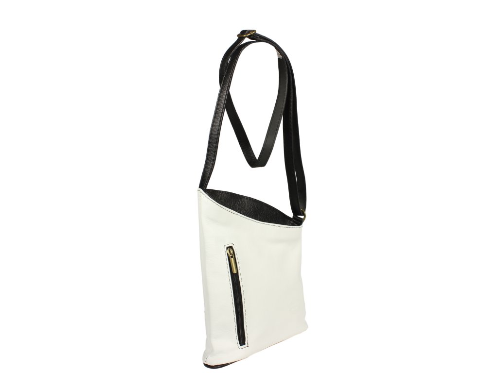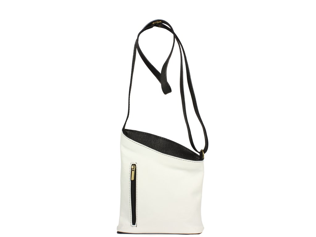 Malá a veľmi praktická kabelka na každodenné nosenie, ktorá Vás osloví najmä svojou jednoduchosťou a zaujímavým tvarom. Je vyrobená z pravej hladkej kože a uzatvára sa pomocou zipsu. Vďaka nastaviteľnému popruhu je možné kabelku nosiť cez rameno alebo cross-body (krížom). Z vonkajšej strany ponúka dve vrecká na zips, vrecko na prednej strane sa uzatvára vertikálne a na zadnej strane horizontálne. Vo vnútri kabelka disponuje ešte jedným malým vreckom na zips, vhodným napríklad pre Váš mobil alebo kľúče. Dĺžka popruhu je max. cca 110 cm.