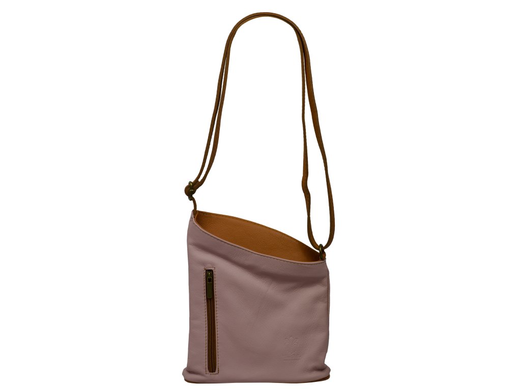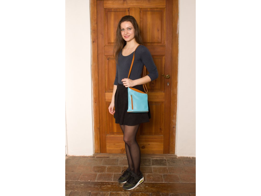 Malá a veľmi praktická kabelka na každodenné nosenie, ktorá Vás osloví najmä svojou jednoduchosťou a zaujímavým tvarom. Je vyrobená z pravej hladkej kože sa uzatvára pomocou zipsu. Vďaka nastaviteľnému popruhu je možné kabelku nosiť cez rameno alebo cross-body (krížom). Z vonkajšej strany ponúka dve vrecká na zips, vrecko na prednej strane sa uzatvára vertikálne a na zadnej strane horizontálne. Vo vnútri kabelka disponuje ešte jedným malým vreckom na zips, vhodným napríklad pre Váš mobil alebo kľúče. Dĺžka popruhu je max. cca 110 cm.