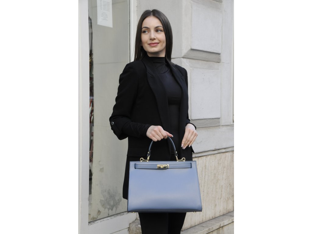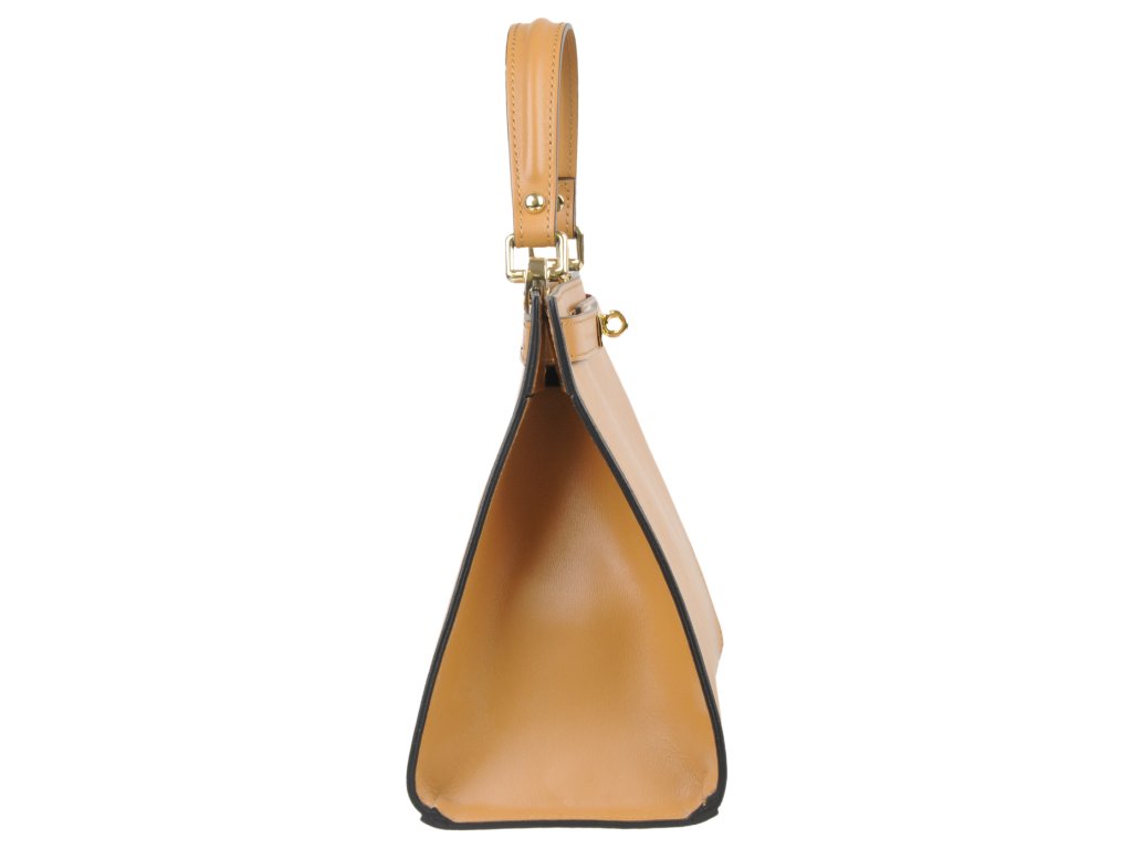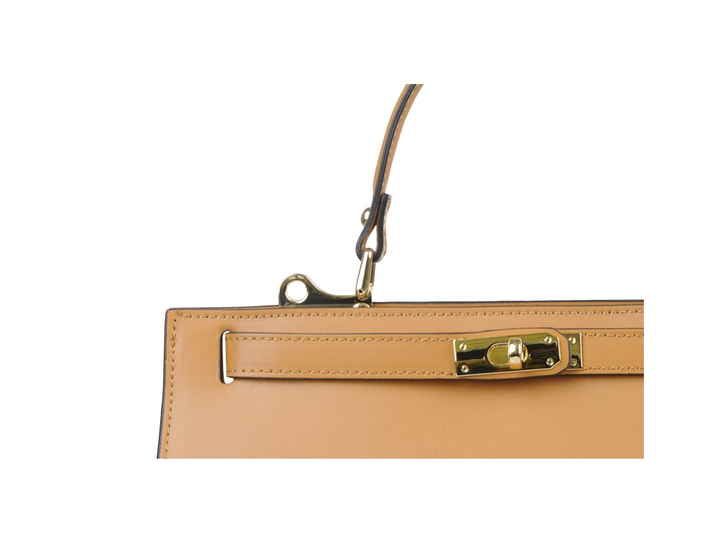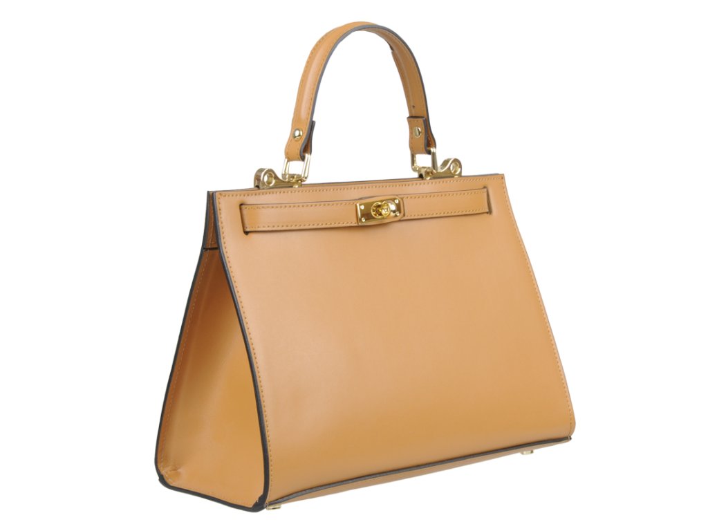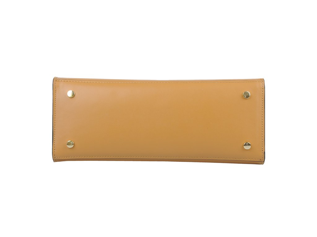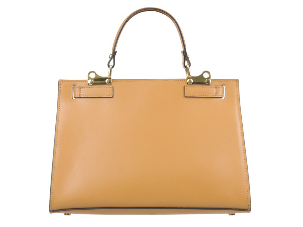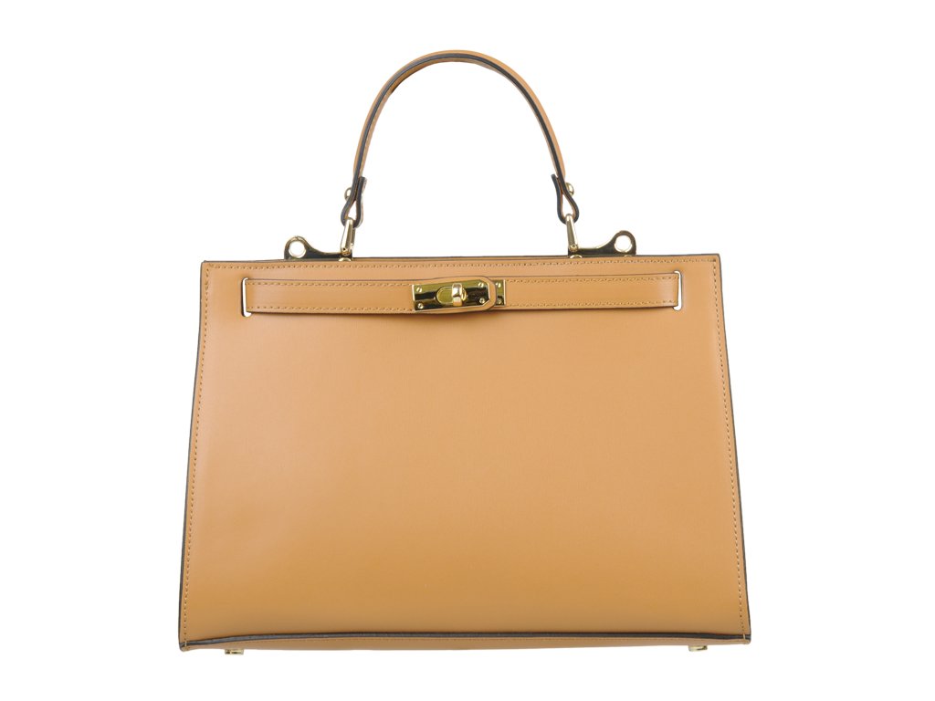Krásna kabelka z pevnej kože v camel farbe. Kabelku je možné nosiť v ruke alebo cez rameno. Max. dĺžka prídavného pásika je 115 cm. Kabelka je vybavená dômyselným a elegantným zapínaním. Vnútri kabelky nájdeme vrecko na mobil či kľúče.