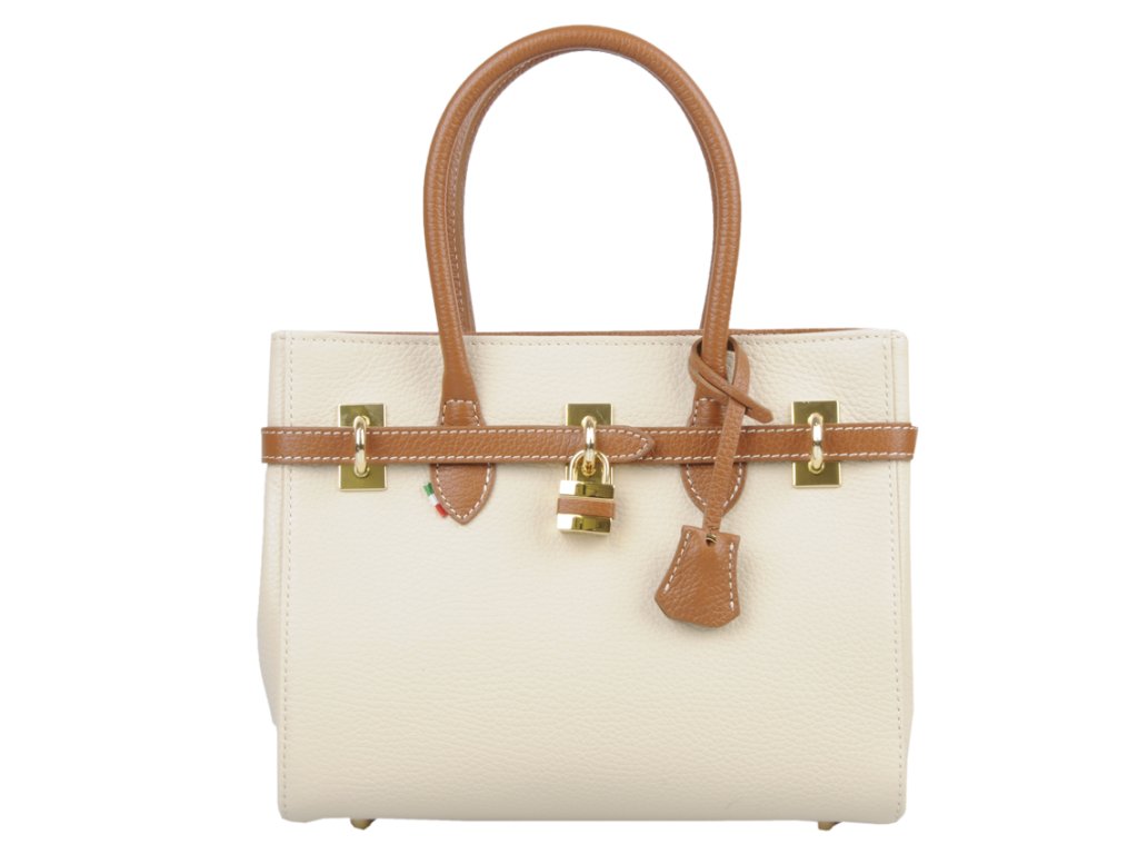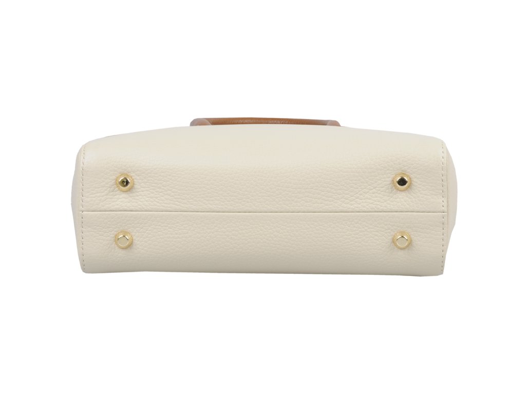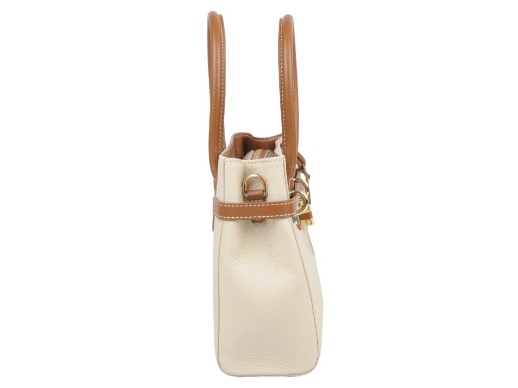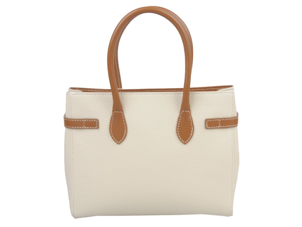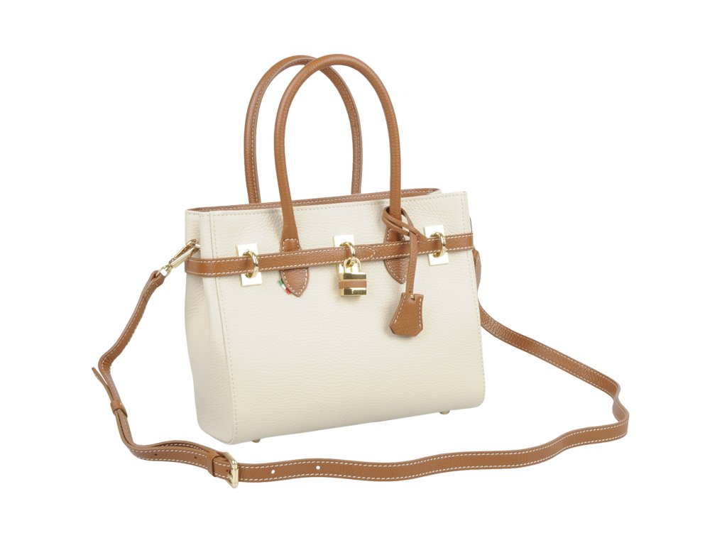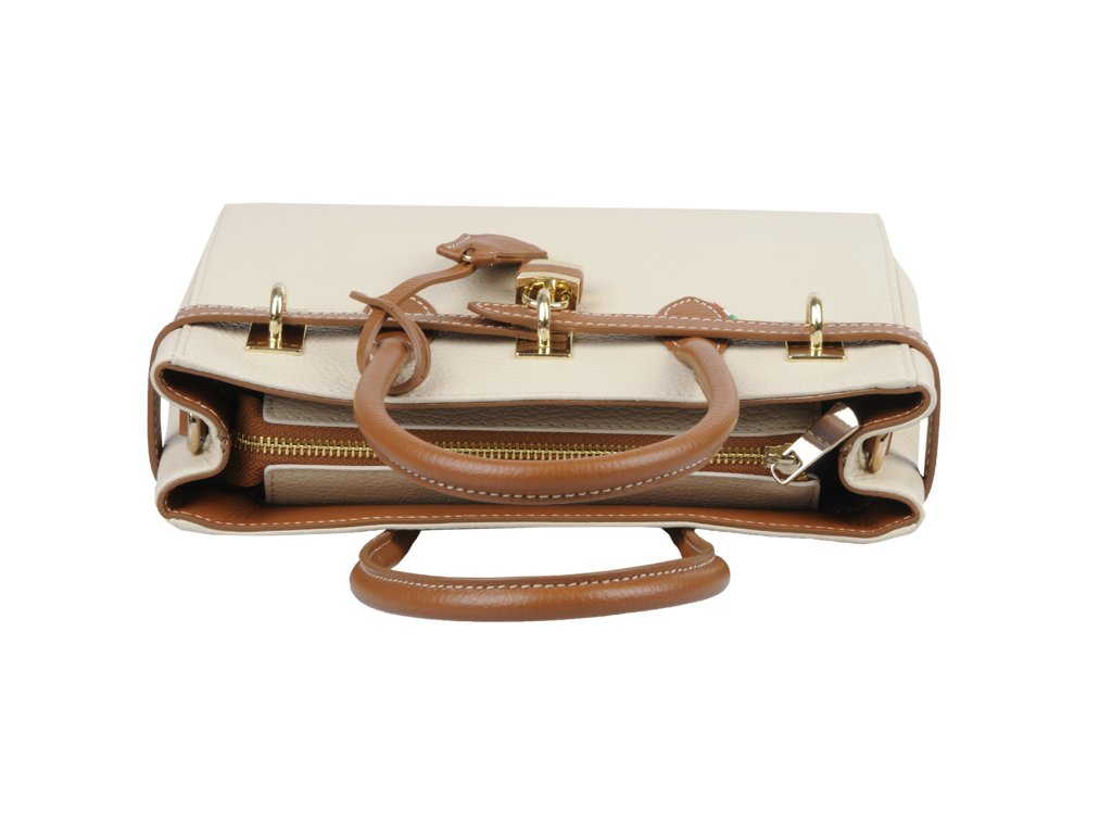 Táto praktická kožená kabelka v béžovej farbe je vyrobená z pravej kože. Je uzatvárateľná na zips. Vo vnútri sa nachádza väčšie vrecko na zips a dve menšie otvorené priehradky. Dľžka popruhu je 120 cm.