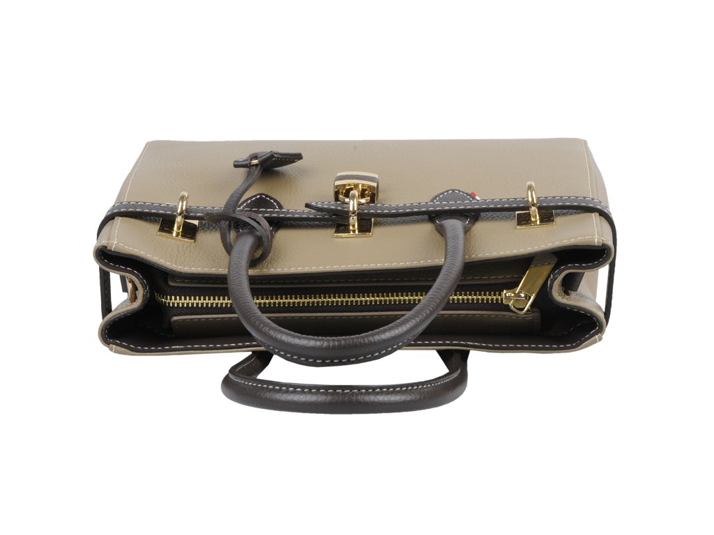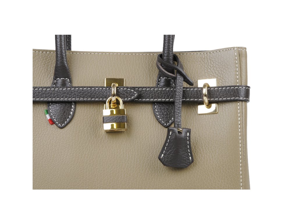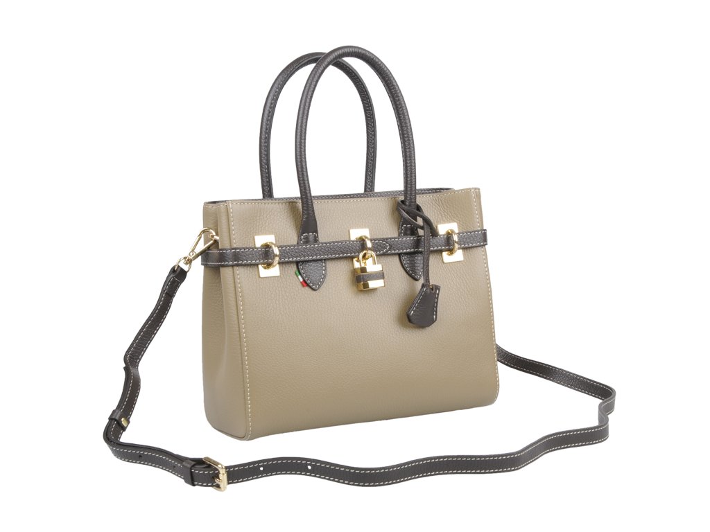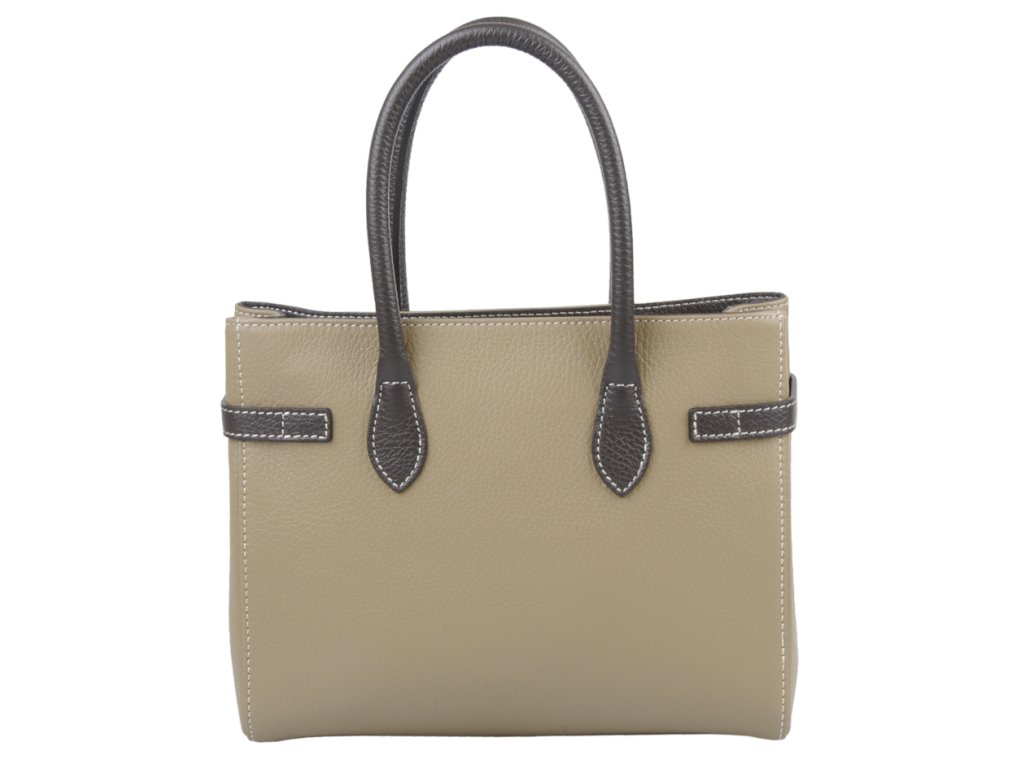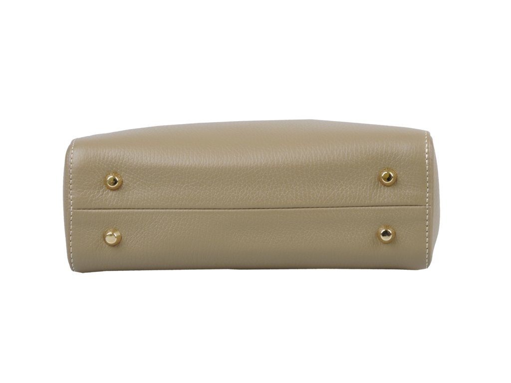 Táto praktická kožená kabelka v tmavo-béžovej farbe je vyrobená z pravej kože. Je uzatvárateľná na zips. Vo vnútri sa nachádza väčšie vrecko na zips a dve menšie otvorené priehradky. Dľžka popruhu je 120 cm.