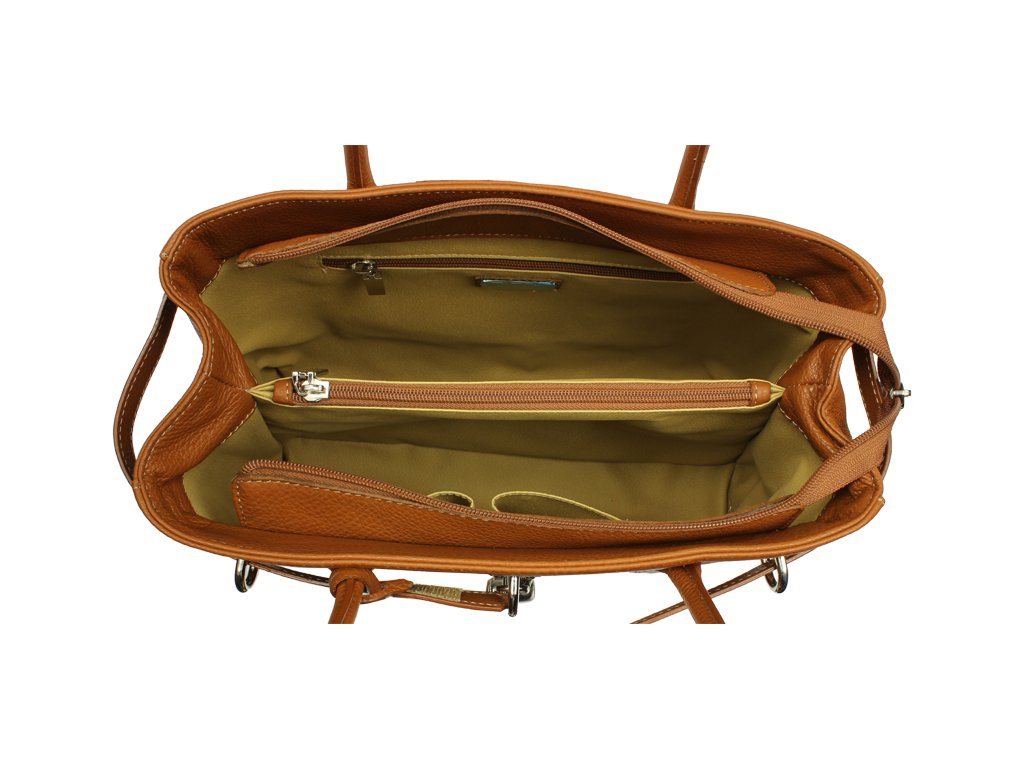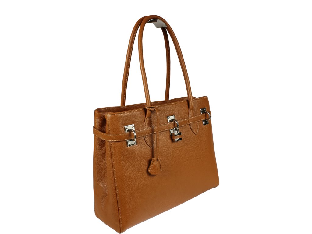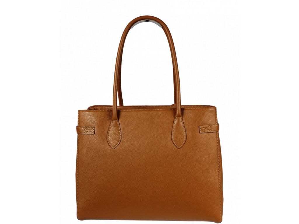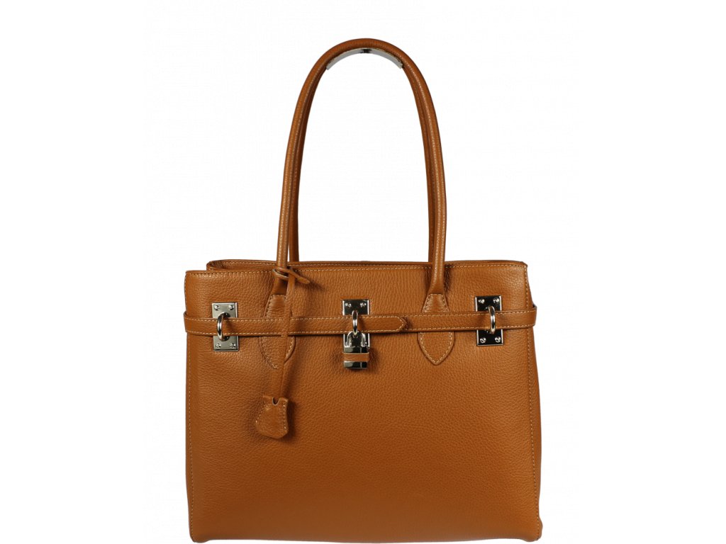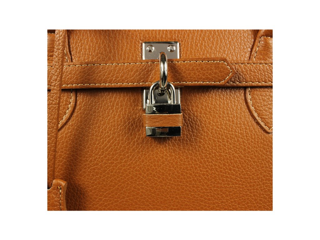 Veľká kabelka nositeľná cez rameno s prepracovaným designom, ktorý dopĺňa dekoračný zámok. Táto kožená kabelka je uzatvárateľná na zips. Je vyrobená z pravej poctivej kože. Vo vnútri disponuje vreckom na zips a 2 malými priehradkami vhodnými napr. pre Váš mobil alebo peňaženku. Hĺbka jej dna je 10,5 cm.