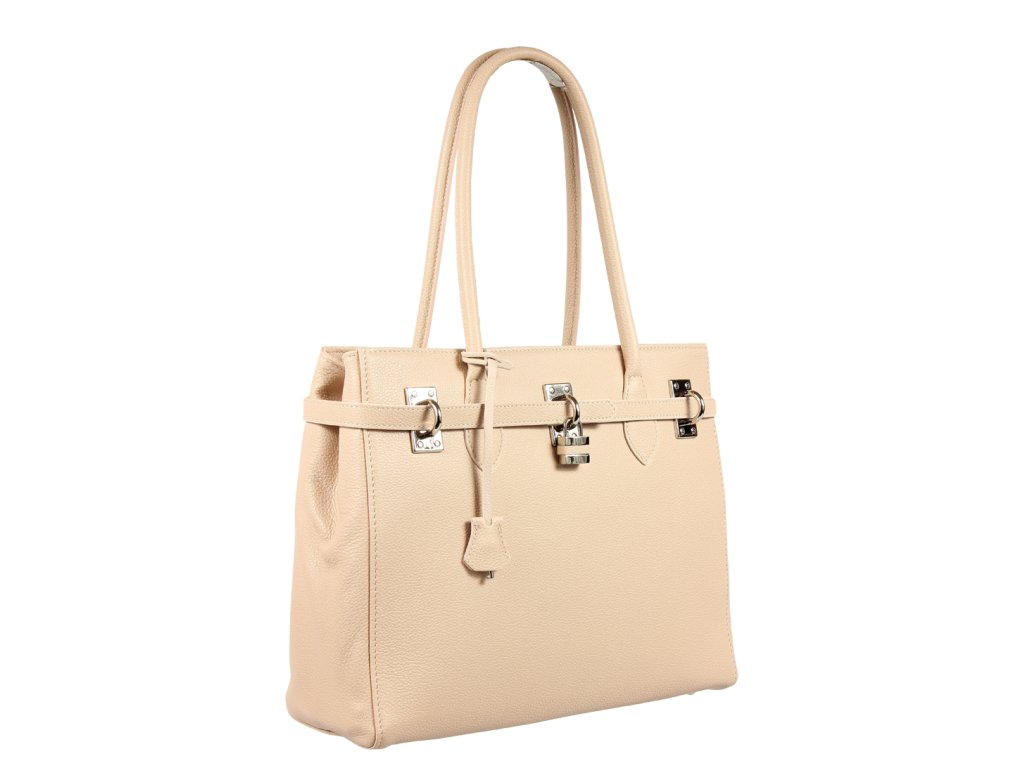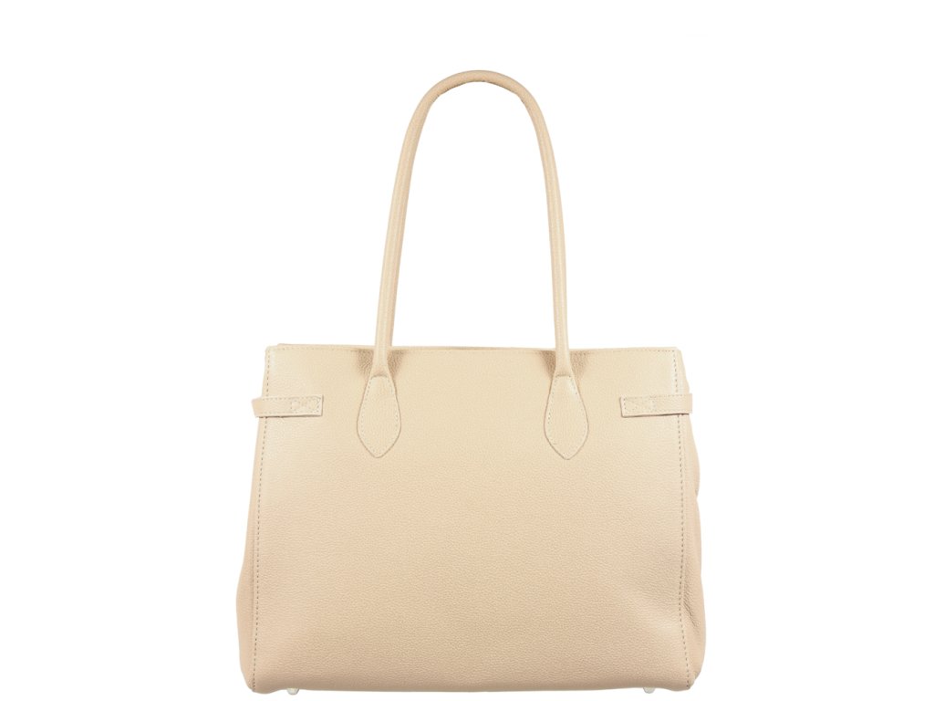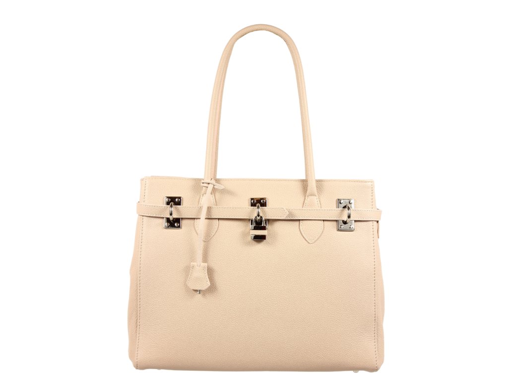 Veľká kabelka nositeľná cez rameno s prepracovaným dizajnom, ktorý dopĺňa dekoračný zámok. Táto kožená kabelka je uzatvárateľná na zips. Je vyrobená z pravej poctivej kože. Vo vnútri disponuje vreckom na zips a 2 malými priehradkami vhodnými napr. pre Váš mobil alebo peňaženku.