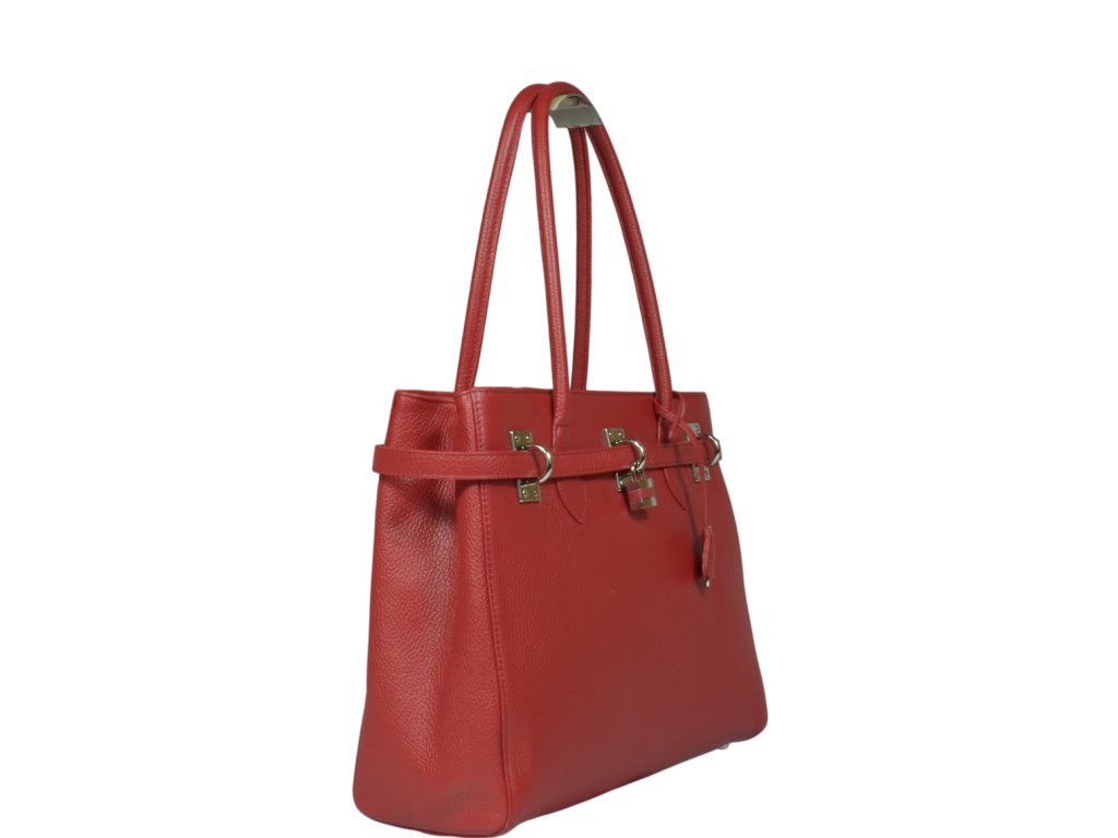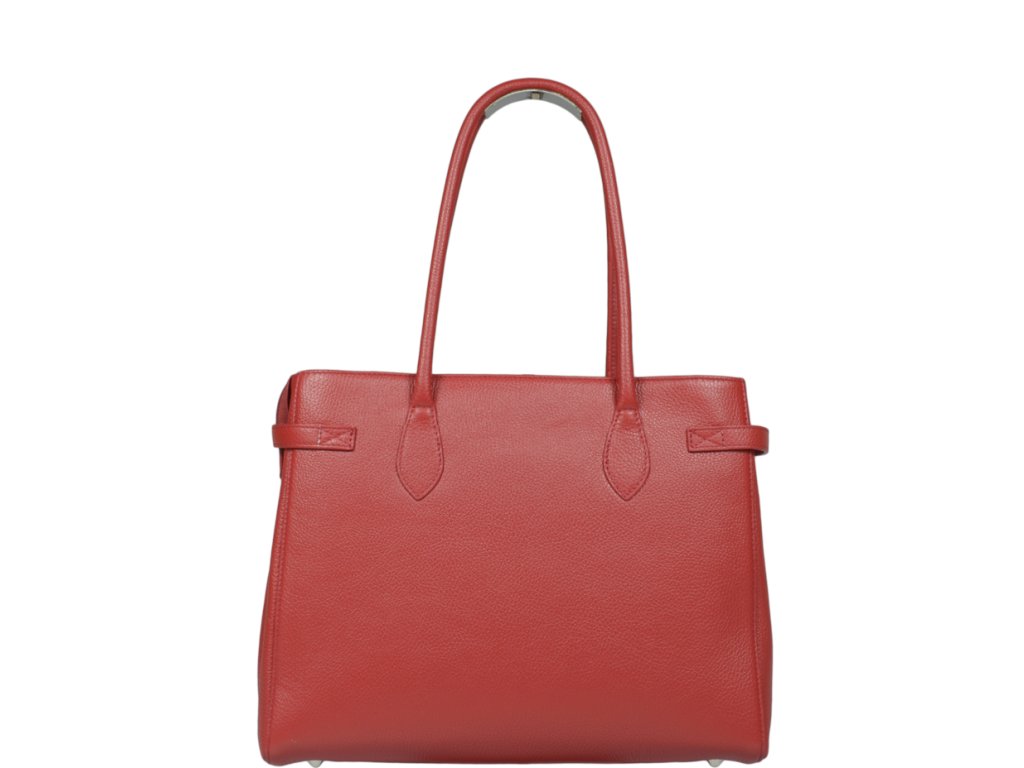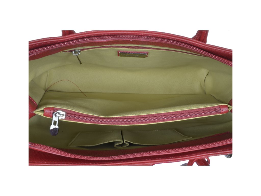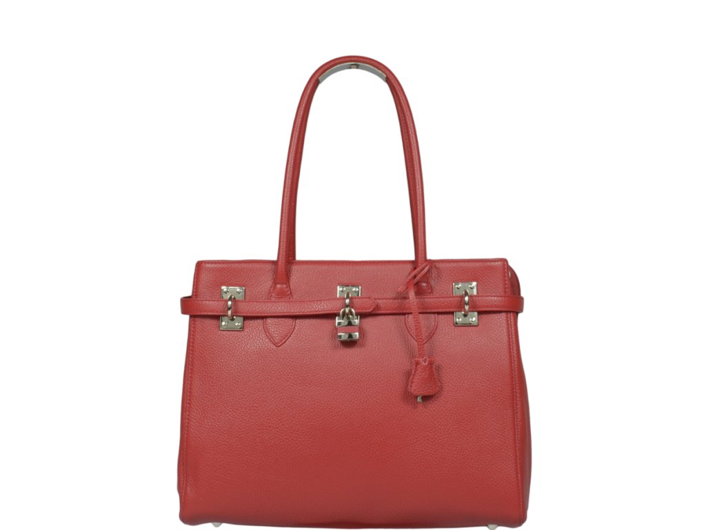 Veľká kabelka nositeľná cez rameno s prepracovaným designom, ktorý dopĺňa dekoračný zámok. Táto červená kožená kabelka je uzatvárateľná na zips. Je vyrobená z pravej poctivej kože. Vo vnútri disponuje vreckom na zips a 2 malými priehradkami vhodnými napr. pre Váš mobil alebo peňaženku. Hĺbka jej dna je 10,5 cm.