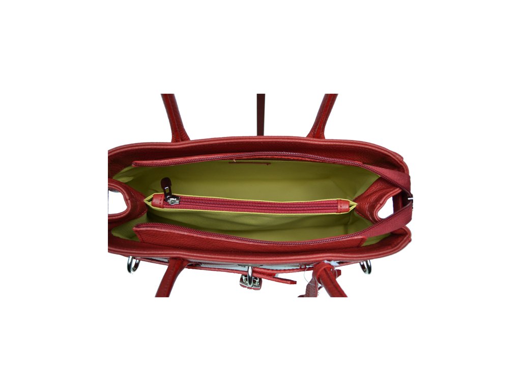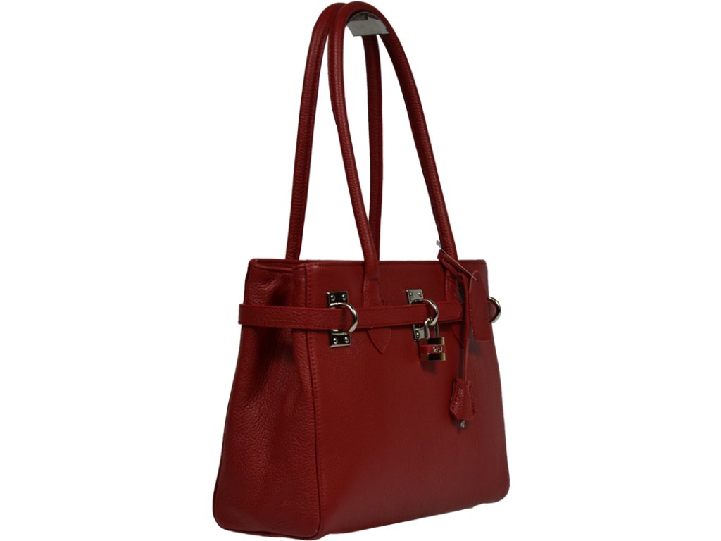 Výrazná červená kabelka strednej veľkosti vyrobená z pravej kože. Uzatvára sa zipsom a je určená na nosenie cez rameno. Vo vnútri kabelka disponuje uzatvárateľnou priehradkou a dvomi malými vreckami. Hĺbka jej dna je 10,5 cm.