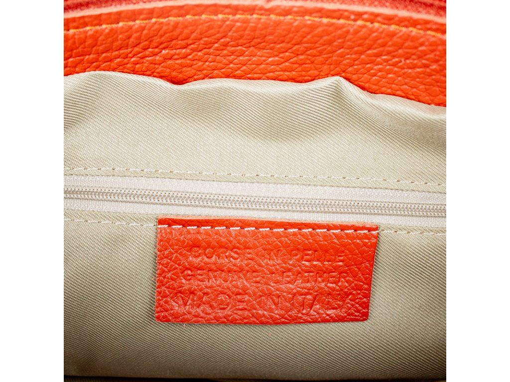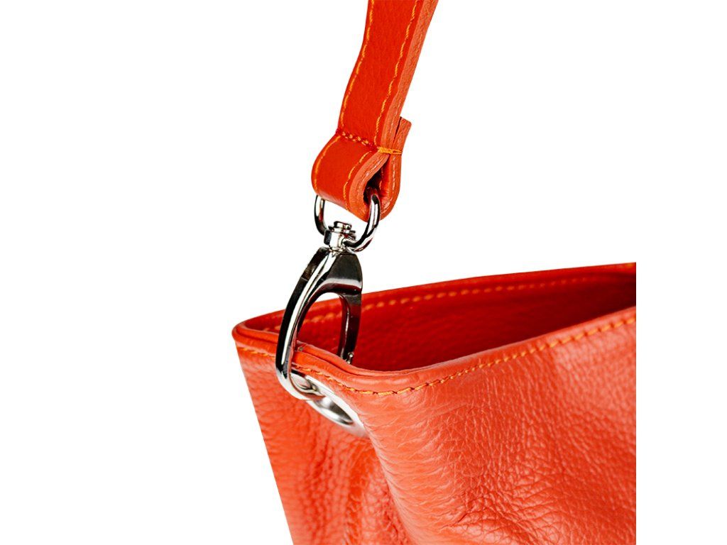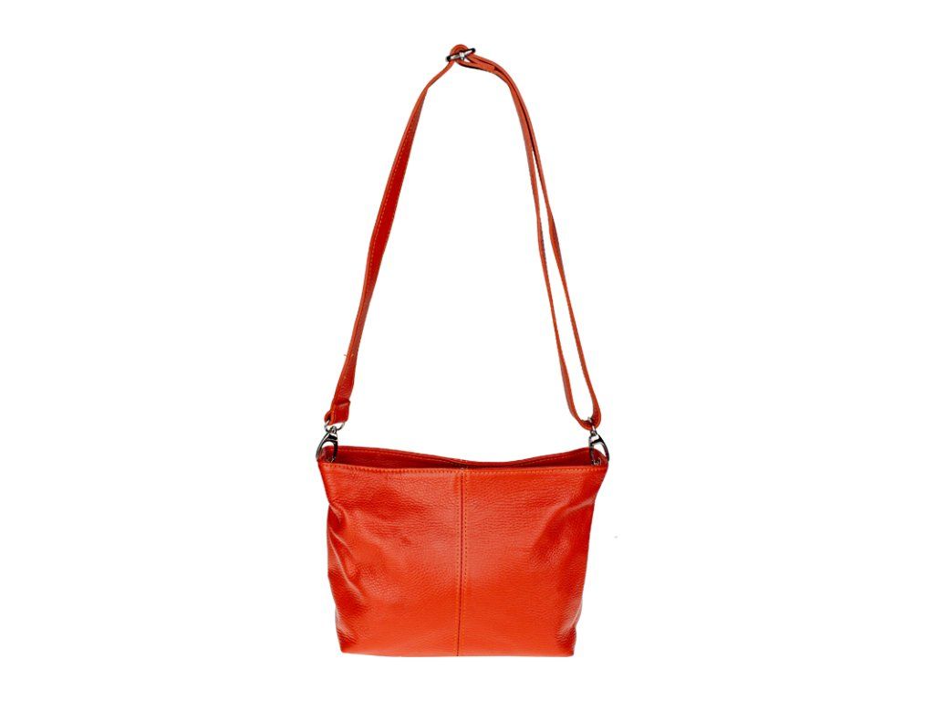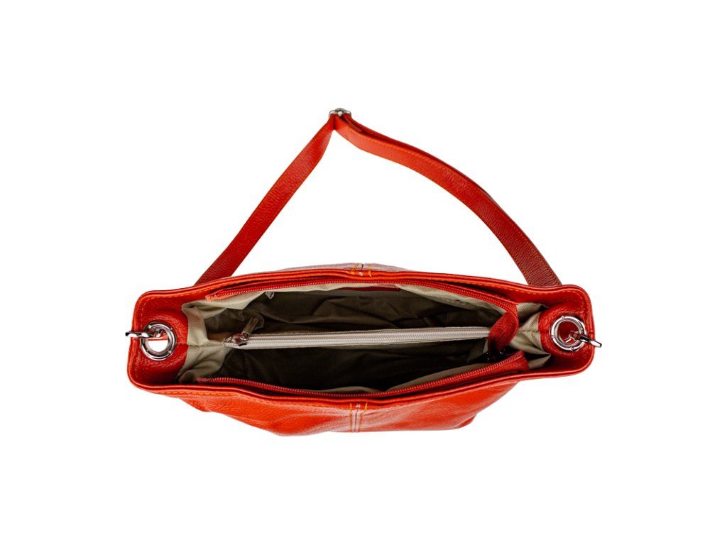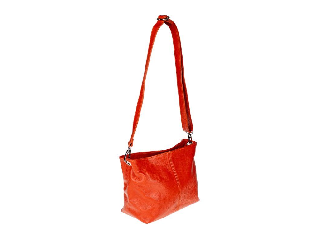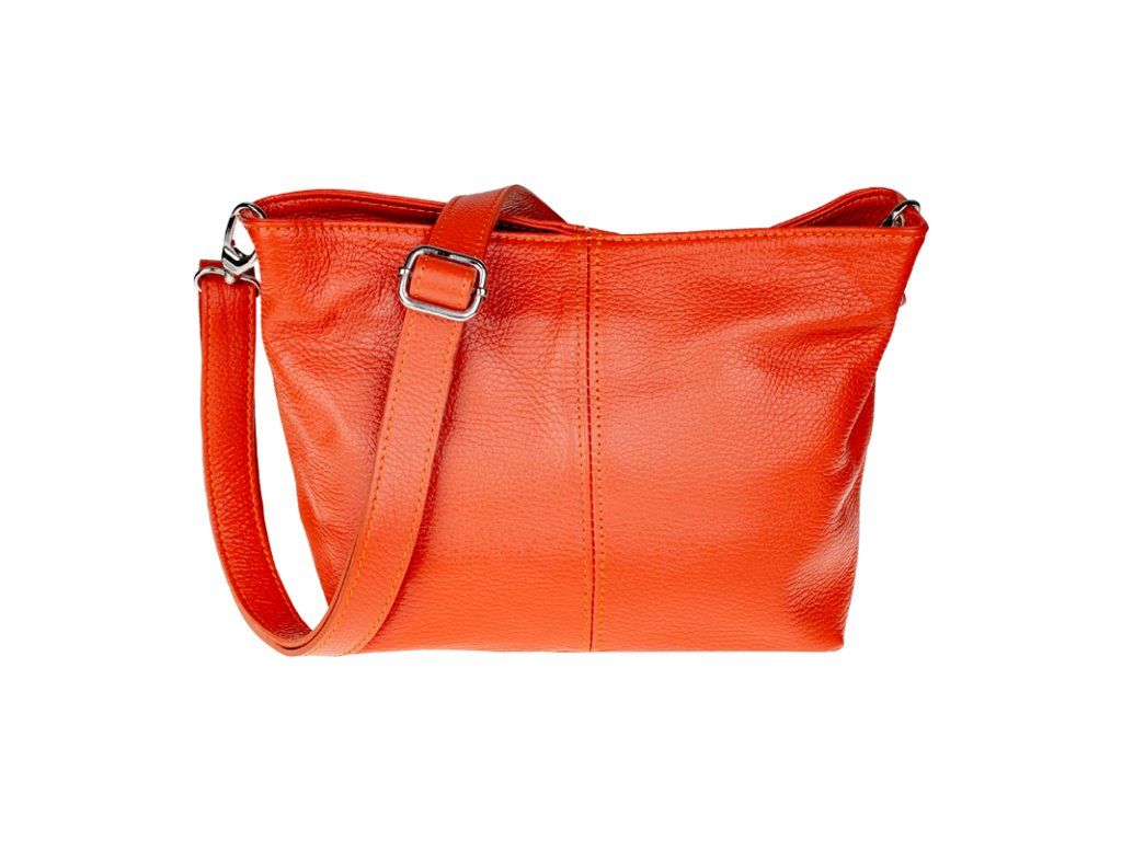 Praktická oranžová kabelka uzatvárateľná na zips, nositeľná cez rameno alebo cross-body (krížom). Vo vnútri disponuje priečkou, ktorá zároveň slúži ako úložná priehradka so zipsom a na bočnej stene sa nachádza ďalšie zipsovacie vrecko. Hĺbka jej dna je 13 cm. Kabelka má naviac nastaviteľný popruh s maximálnou dĺžkou cca 120 cm.