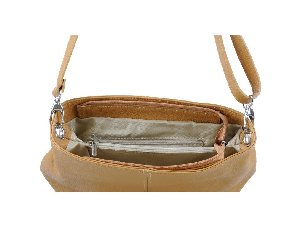 Praktická hnedá kabelka uzatvárateľná na zips, nositeľná cez rameno alebo cross-body (krížom). Vo vnútri disponuje priečkou, ktorá zároveň slúži ako úložná priehradka so zipsom a na bočnej stene sa nachádza ďalšie zipsovacie vrecko. Hĺbka jej dna je 13 cm. Kabelka má naviac nastaviteľný popruh s maximálnou dĺžkou cca 120 cm.