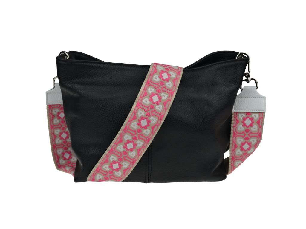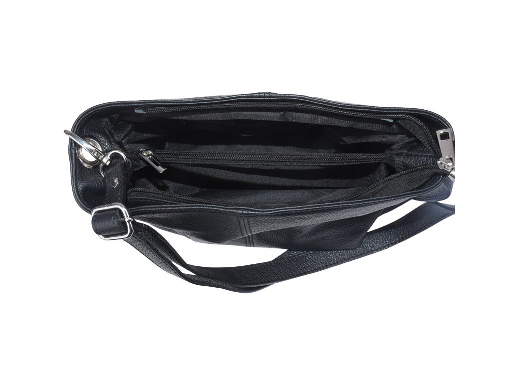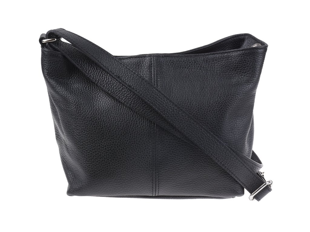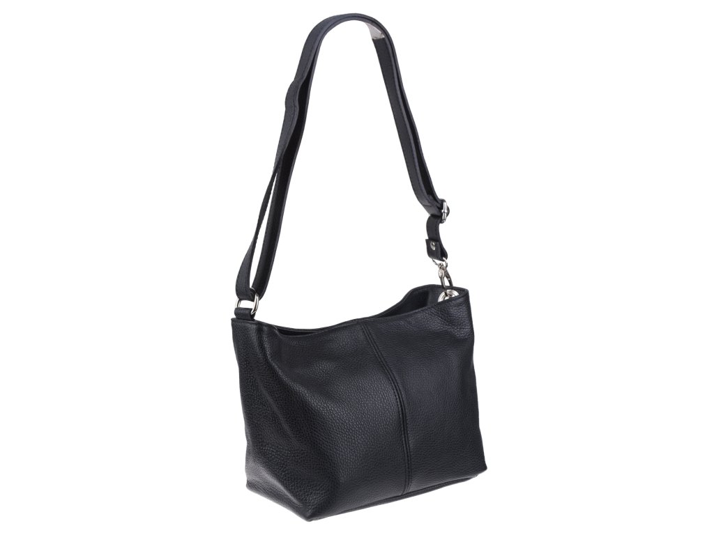 Praktická čierna kabelka uzatvárateľná na zips, nositeľná cez rameno alebo cross-body (krížom). Vo vnútri disponuje priečkou, ktorá zároveň slúži ako úložná priehradka so zipsom a na bočnej stene sa nachádza ďalšie zipsovacie vrecko. Hĺbka jej dna je 13 cm.