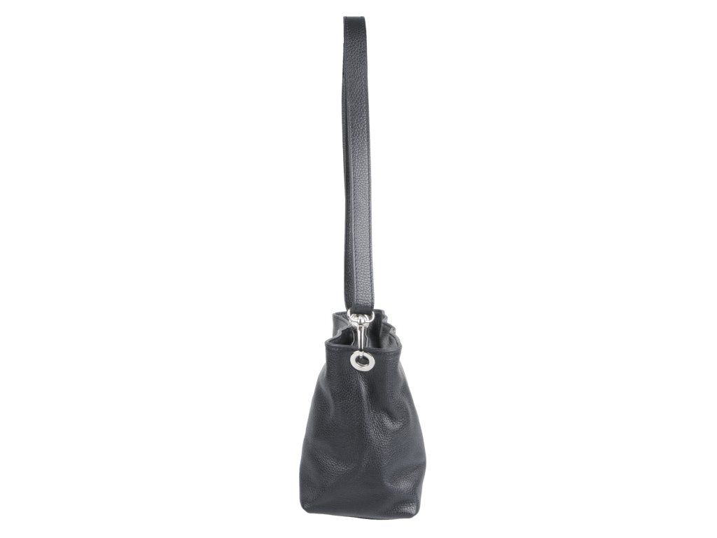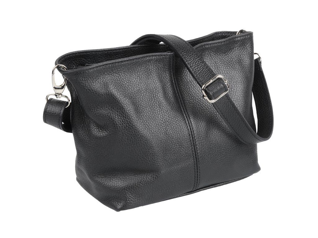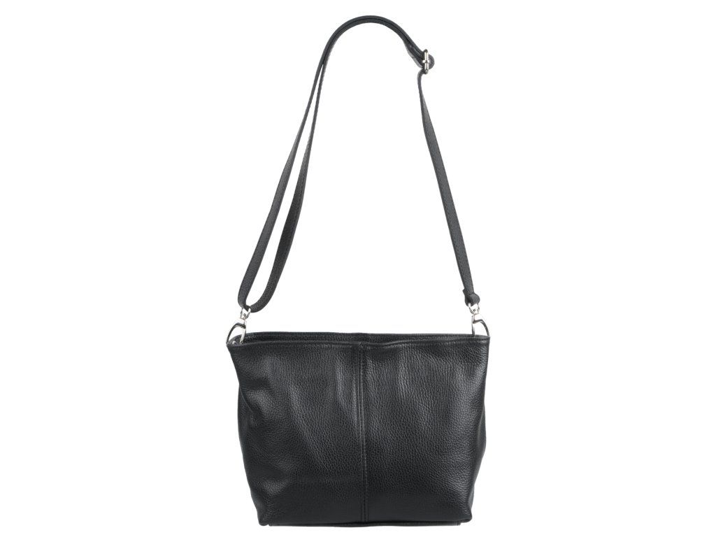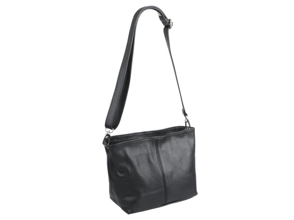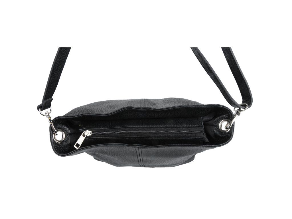 Praktická čierna kabelka uzatvárateľná na zips, nositeľná cez rameno alebo cross-body (krížom). Vo vnútri disponuje priečkou, ktorá zároveň slúži ako úložná priehradka so zipsom a na bočnej stene sa nachádza ďalšie zipsovacie vrecko. Hĺbka jej dna je 13 cm. Kabelka má naviac nastaviteľný popruh s maximálnou dĺžkou cca 120 cm.