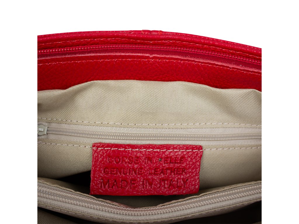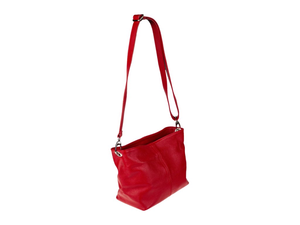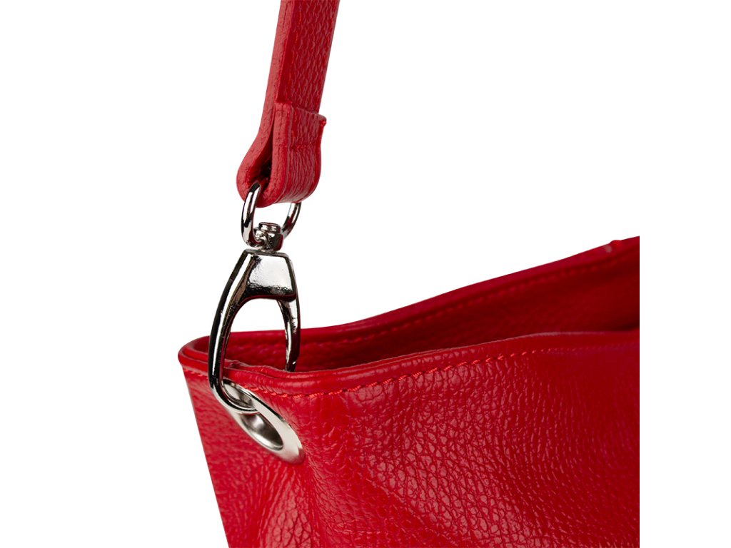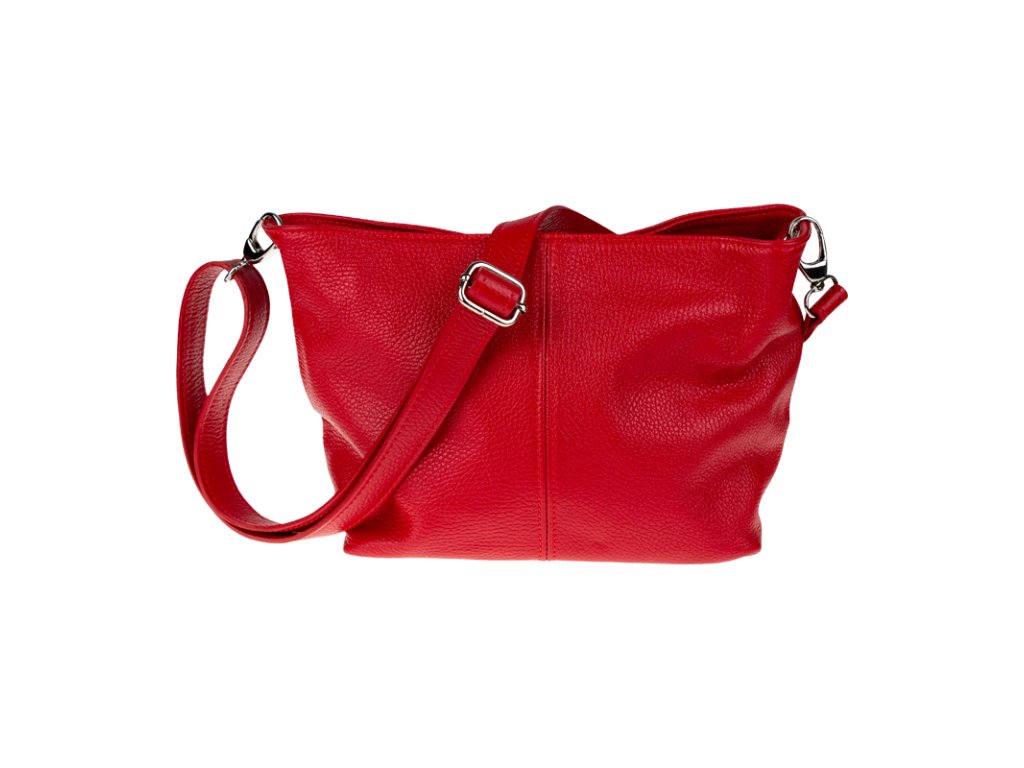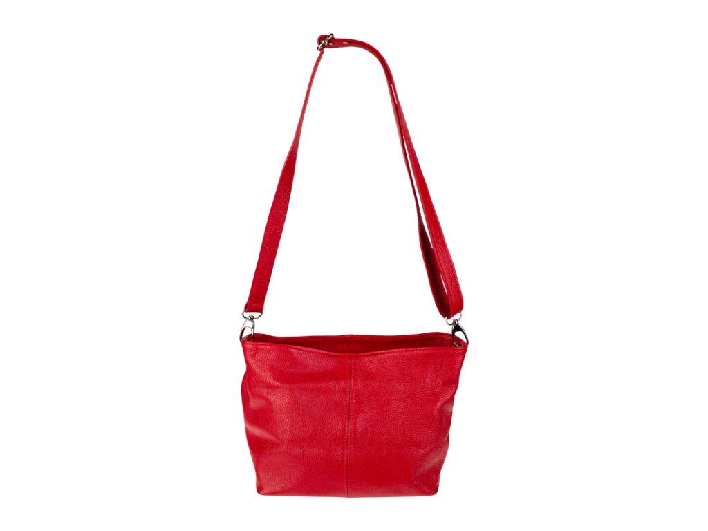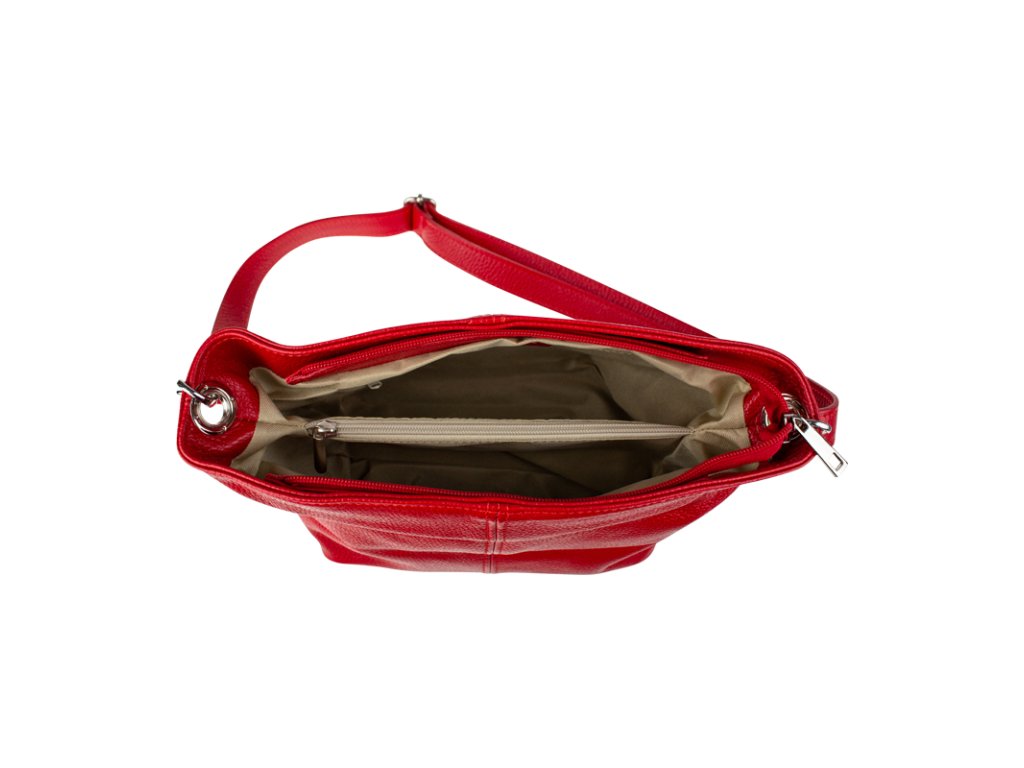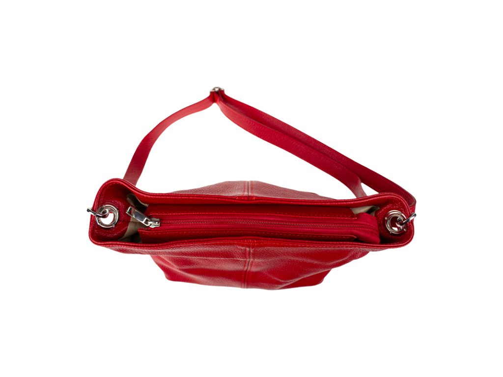 Praktická červená kabelka uzatvárateľná na zips, nositeľná cez rameno alebo cross-body (krížom). Vo vnútri disponuje priečkou, ktorá zároveň slúži ako úložná priehradka so zipsom a na bočnej stene sa nachádza ďalšie zipsovacie vrecko. Hĺbka jej dna je 13 cm. Kabelka má naviac nastaviteľný popruh s maximálnou dĺžkou cca 120 cm.