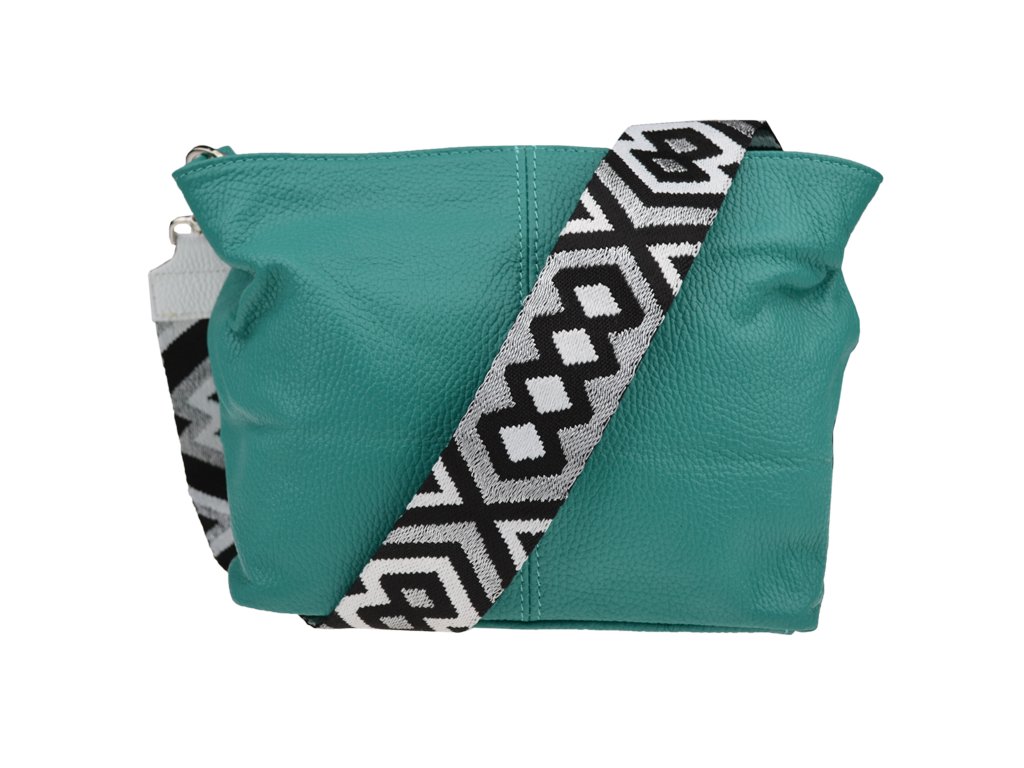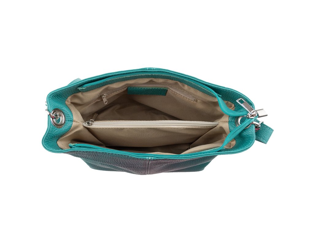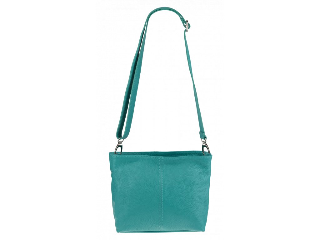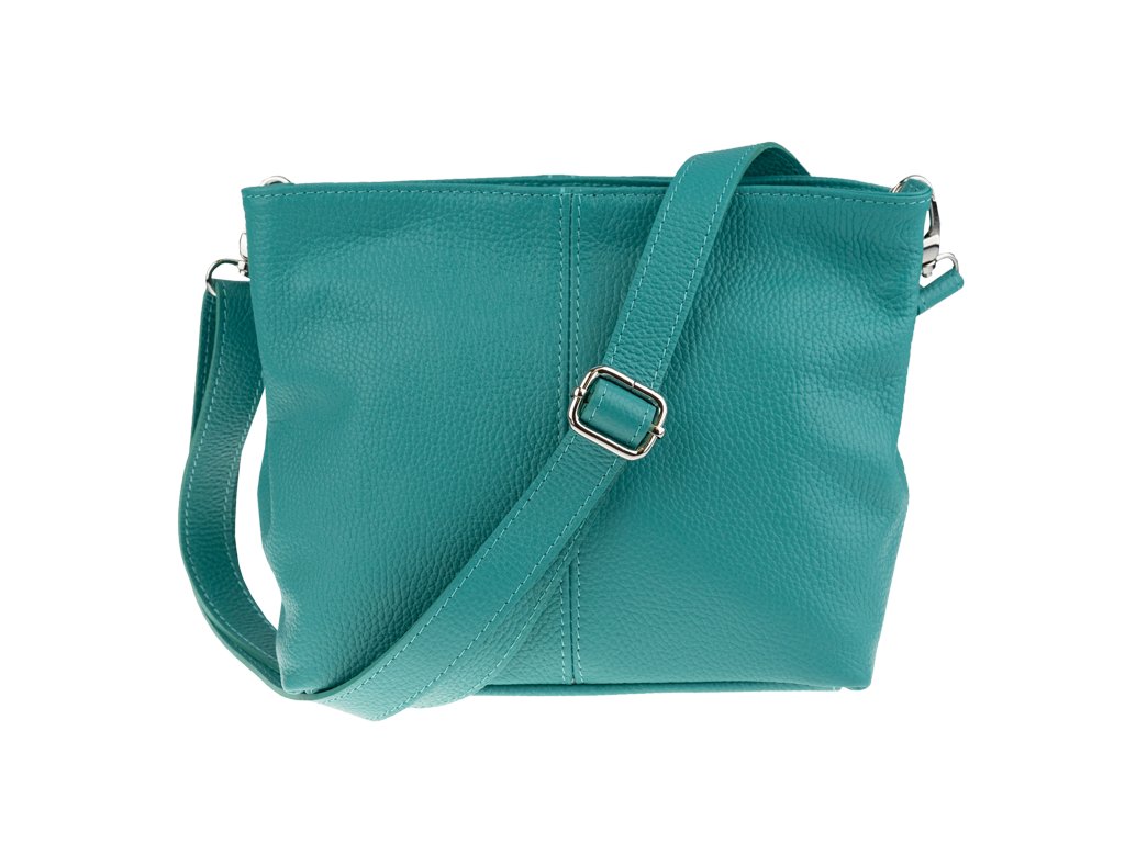 Praktická tyrkysová kabelka uzatvárateľná na zips, nositeľná cez rameno alebo cross-body (krížom). Vo vnútri disponuje priečkou, ktorá zároveň slúži ako úložná priehradka so zipsom a na bočnej stene sa nachádza ďalšie zipsovacie vrecko. Hĺbka jej dna je 13 cm. Kabelka má naviac nastaviteľný popruh s maximálnou dĺžkou cca 120 cm.