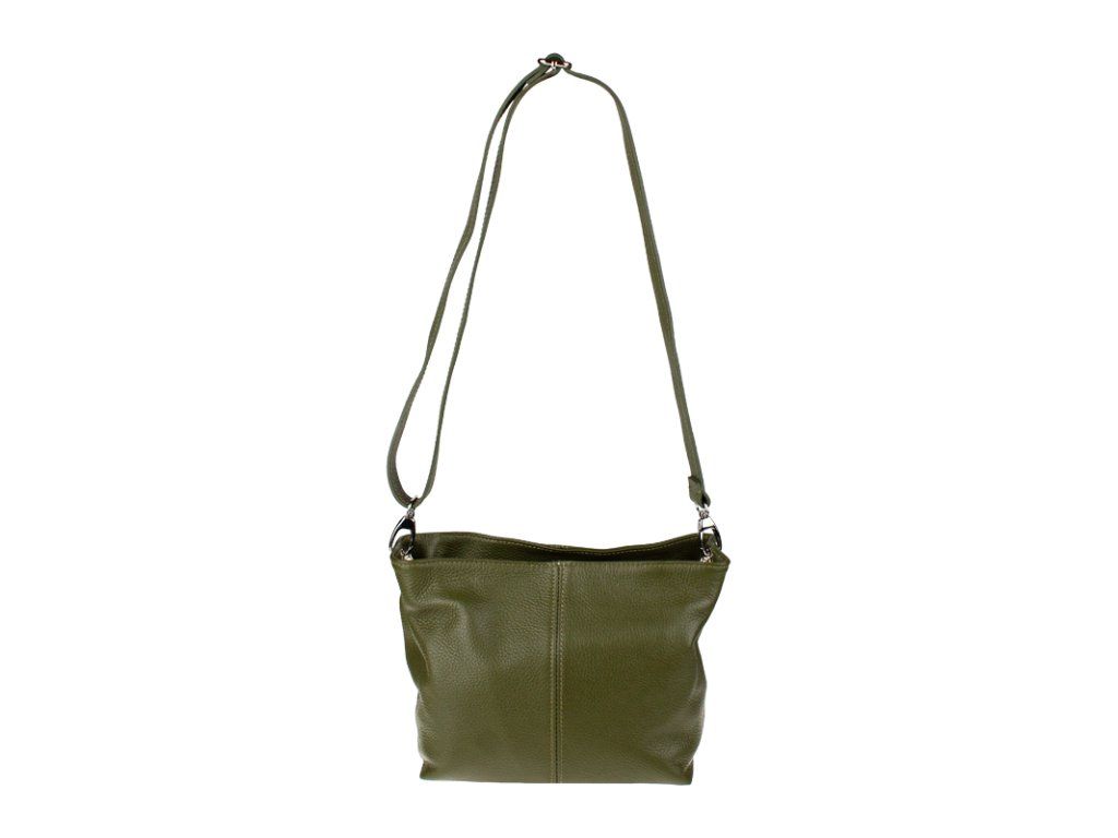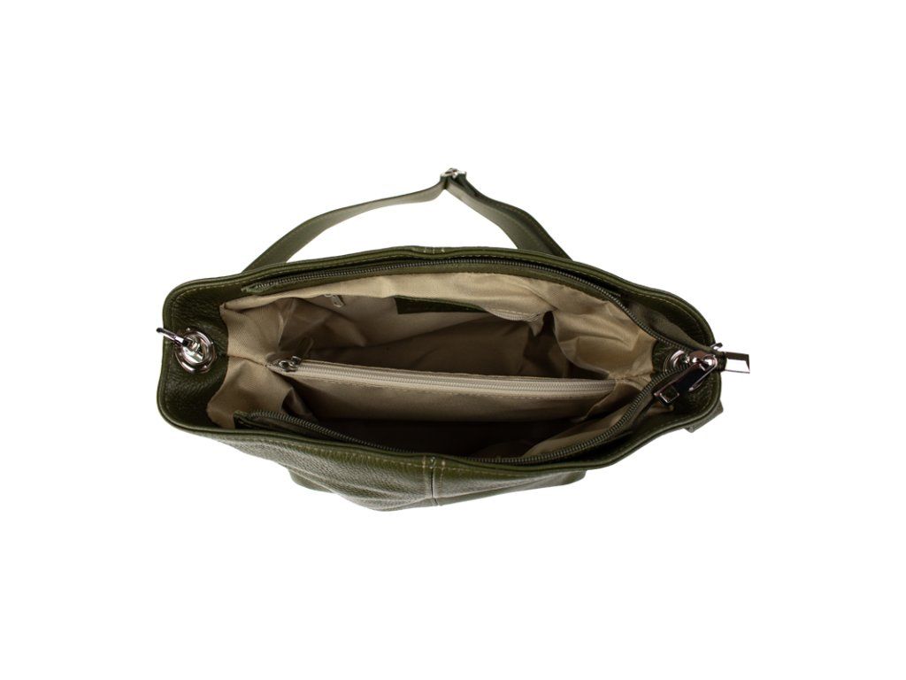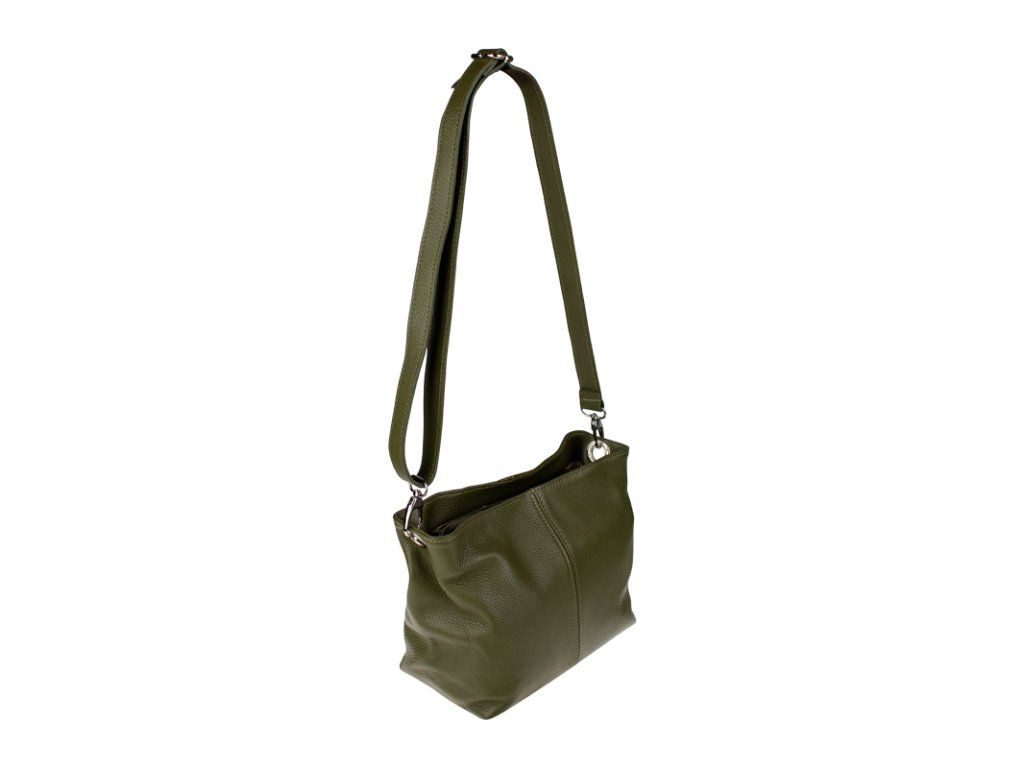 Praktická zelená kabelka uzatvárateľná na zips, nositeľná cez rameno alebo cross-body (krížom). Vo vnútri disponuje priečkou, ktorá zároveň slúži ako úložná priehradka so zipsom a na bočnej stene sa nachádza ďalšie zipsovacie vrecko. Hĺbka jej dna je 13 cm. Kabelka má naviac nastaviteľný popruh s maximálnou dĺžkou cca 120 cm.