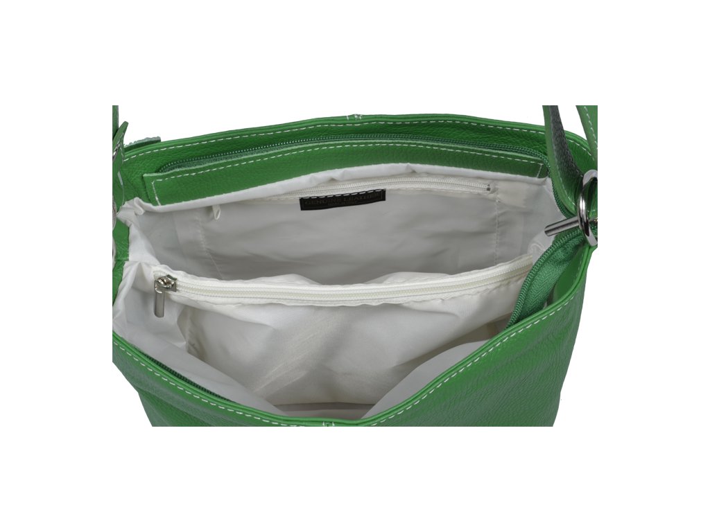Praktická zelená kabelka uzatvárateľná na zips, nositeľná cez rameno alebo cross-body (krížom). Vo vnútri disponuje priečkou, ktorá zároveň slúži ako úložná priehradka so zipsom a na bočnej stene sa nachádza ďalšie zipsovacie vrecko. Hĺbka jej dna je 13 cm. Kabelka má naviac nastaviteľný popruh s maximálnou dĺžkou cca 120 cm.