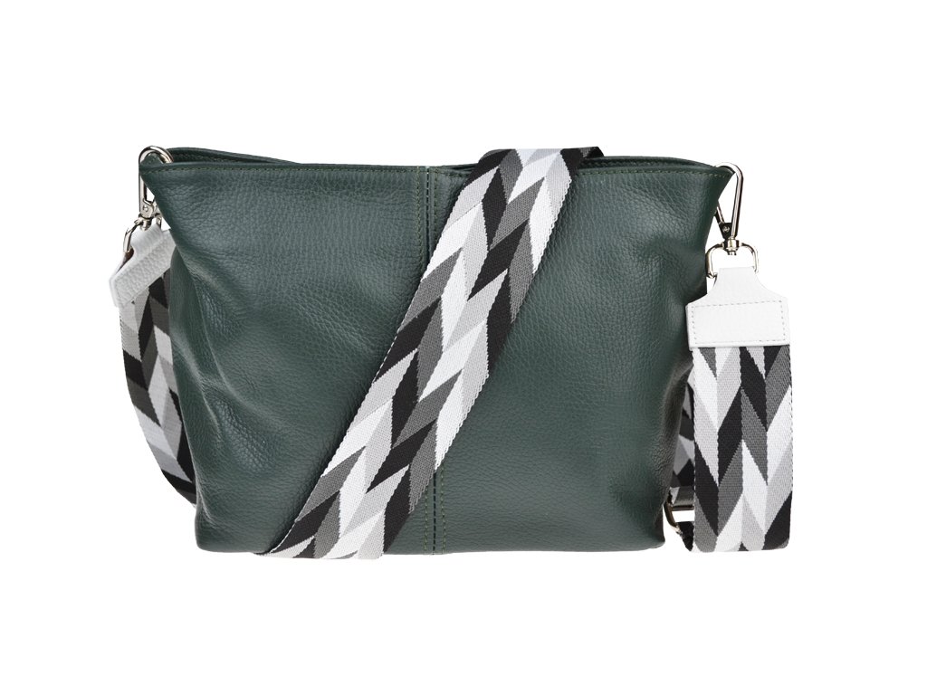 Praktická zelená kabelka uzatvárateľná na zips, nositeľná cez rameno alebo cross-body (krížom). Vo vnútri disponuje priečkou, ktorá zároveň slúži ako úložná priehradka so zipsom a na bočnej stene sa nachádza ďalšie zipsovacie vrecko. Hĺbka jej dna je 13 cm.