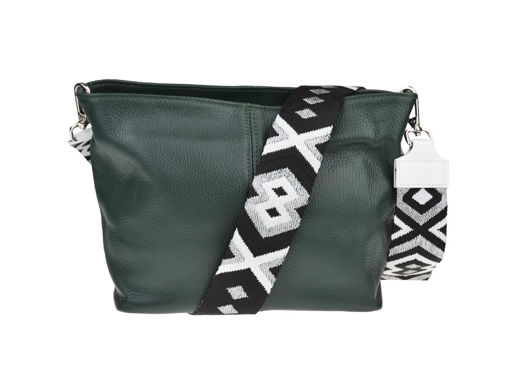Praktická zelená kabelka uzatvárateľná na zips, nositeľná cez rameno alebo cross-body (krížom). Vo vnútri disponuje priečkou, ktorá zároveň slúži ako úložná priehradka so zipsom a na bočnej stene sa nachádza ďalšie zipsovacie vrecko. Hĺbka jej dna je 13 cm.