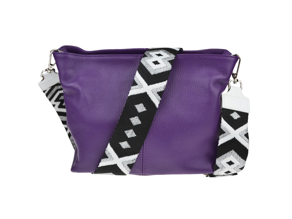 Praktická fialová kabelka uzatvárateľná na zips, nositeľná cez rameno alebo cross-body (krížom). Vo vnútri disponuje priečkou, ktorá zároveň slúži ako úložná priehradka so zipsom a na bočnej stene sa nachádza ďalšie zipsovacie vrecko. Hĺbka jej dna je 13 cm.