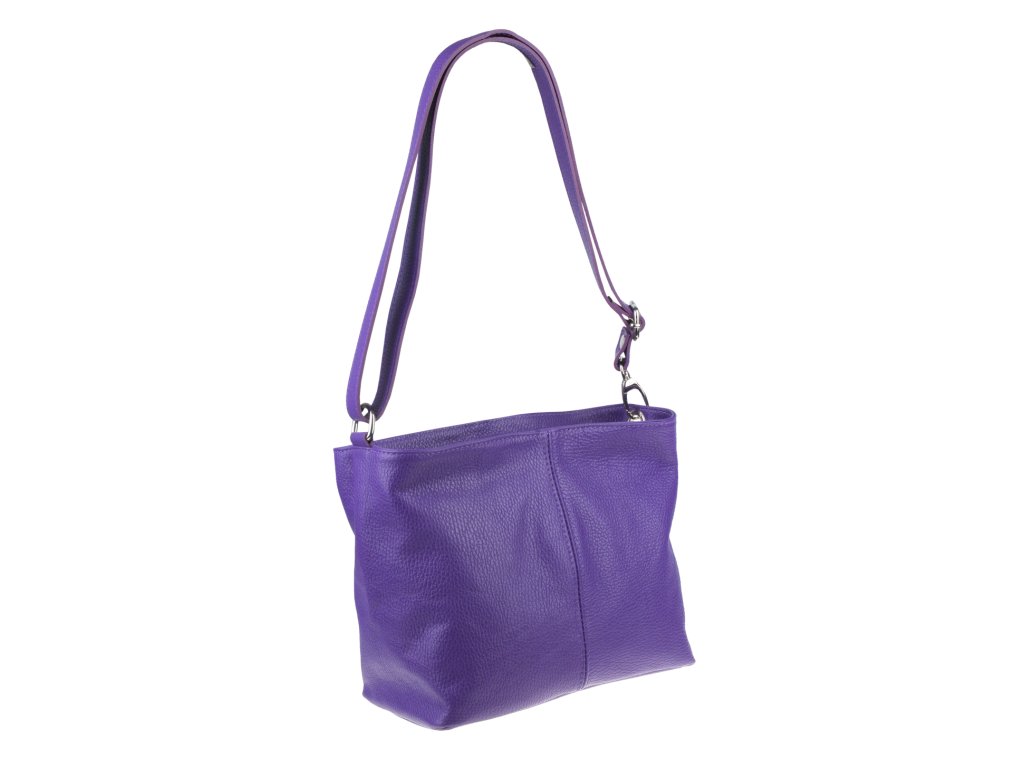Praktická fialová kabelka uzatvárateľná na zips, nositeľná cez rameno alebo cross-body (krížom). Vo vnútri disponuje priečkou, ktorá zároveň slúži ako úložná priehradka so zipsom a na bočnej stene sa nachádza ďalšie zipsovacie vrecko. Hĺbka jej dna je 13 cm.