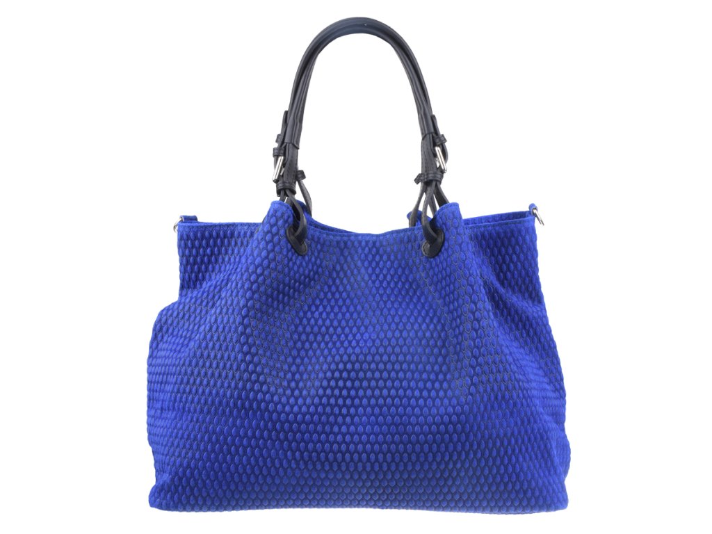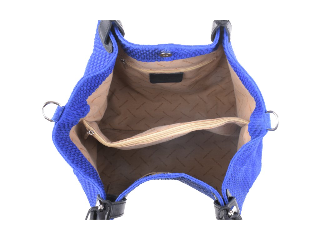 Moderná obľúbená kabelka s nekonvenčným dizajnom v modrom farebnom prevedení. Táto kožená kabelka je uzatvárateľná pomocou magnetickej patentky. Je z pravej kože, avšak so štruktúrovanou textúrou. Disponuje nastaviteľnými ušami, takže je možné ju nosiť cez rameno. Súčasťou balenia je prídavný popruh v dĺžke cca 105 cm. Vo vnútri je priečka slúžiaca ako úložná priehradka na zips, na bočných stenách nájdete ďalšie zipsovacie vrecko a jedno malé vrecko. Bez problémov sa do nej zmestia dokumenty formátu A4.
