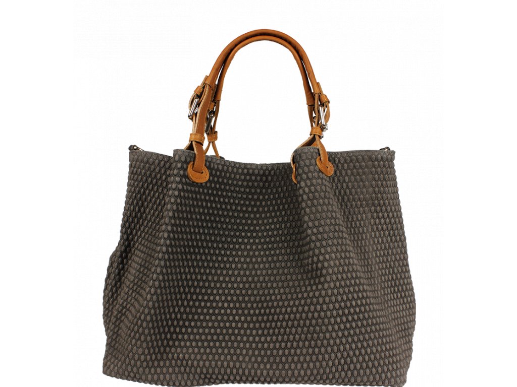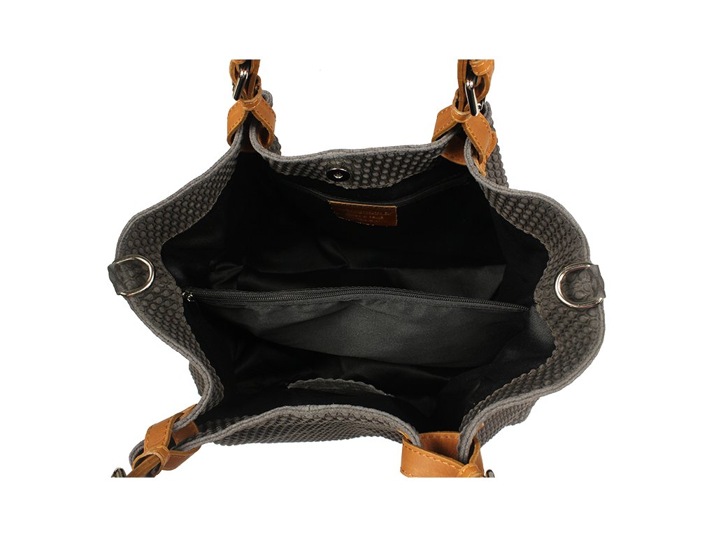 Moderná obľúbená kabelka s nekonvenčným dizajnom v sivo-hnedom farebnom prevedení. Táto kožená kabelka je uzatvárateľná pomocou magnetickej patentky. Je z pravej kože, avšak so štruktúrovanou textúrou. Disponuje nastaviteľnými ušami, takže je možné ju nosiť cez rameno. Súčasťou balenia je prídavný popruh v dĺžke cca 105 cm. Vo vnútri je priečka slúžiaca ako úložná priehradka na zips, na bočných stenách nájdete ďalšie zipsovacie vrecko a jedno malé vrecko. Bez problémov sa do nej zmestia dokumenty formátu A4.