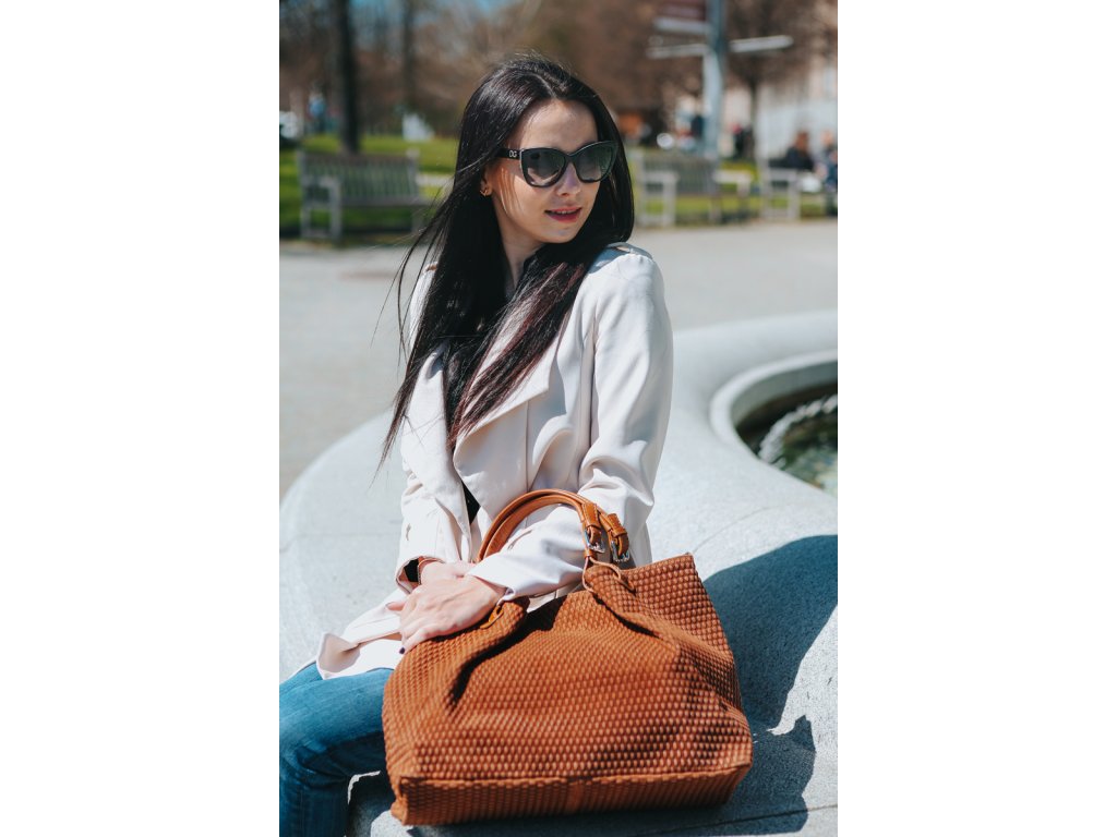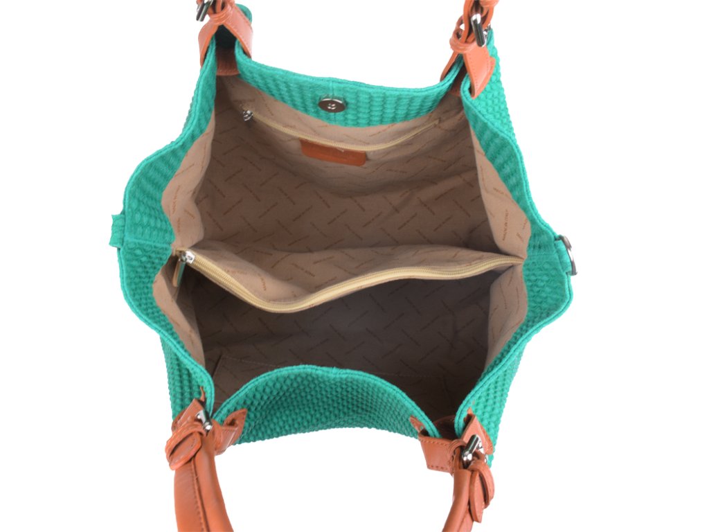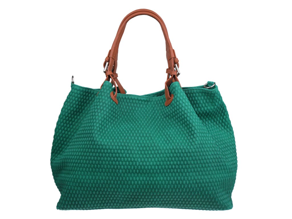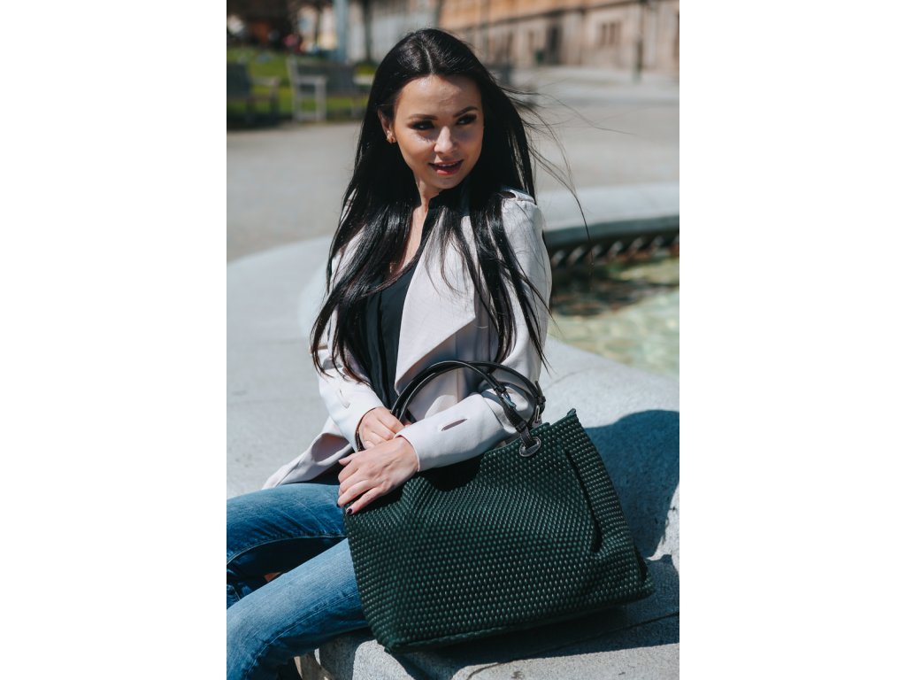 Moderná obľúbená kabelka s nekonvenčným dizajnom v zelenom farebnom prevedení. Táto kožená kabelka je uzatvárateľná pomocou magnetickej patentky. Je z pravej kože, avšak so štruktúrovanou textúrou. Disponuje nastaviteľnými ušami, takže je možné ju nosiť cez rameno. Súčasťou balenia je prídavný popruh v dĺžke cca 105 cm. Vo vnútri je priečka slúžiaca ako úložná priehradka na zips, na bočných stenách nájdete ďalšie zipsovacie vrecko a jedno malé vrecko. Bez problémov sa do nej zmestia dokumenty formátu A4.